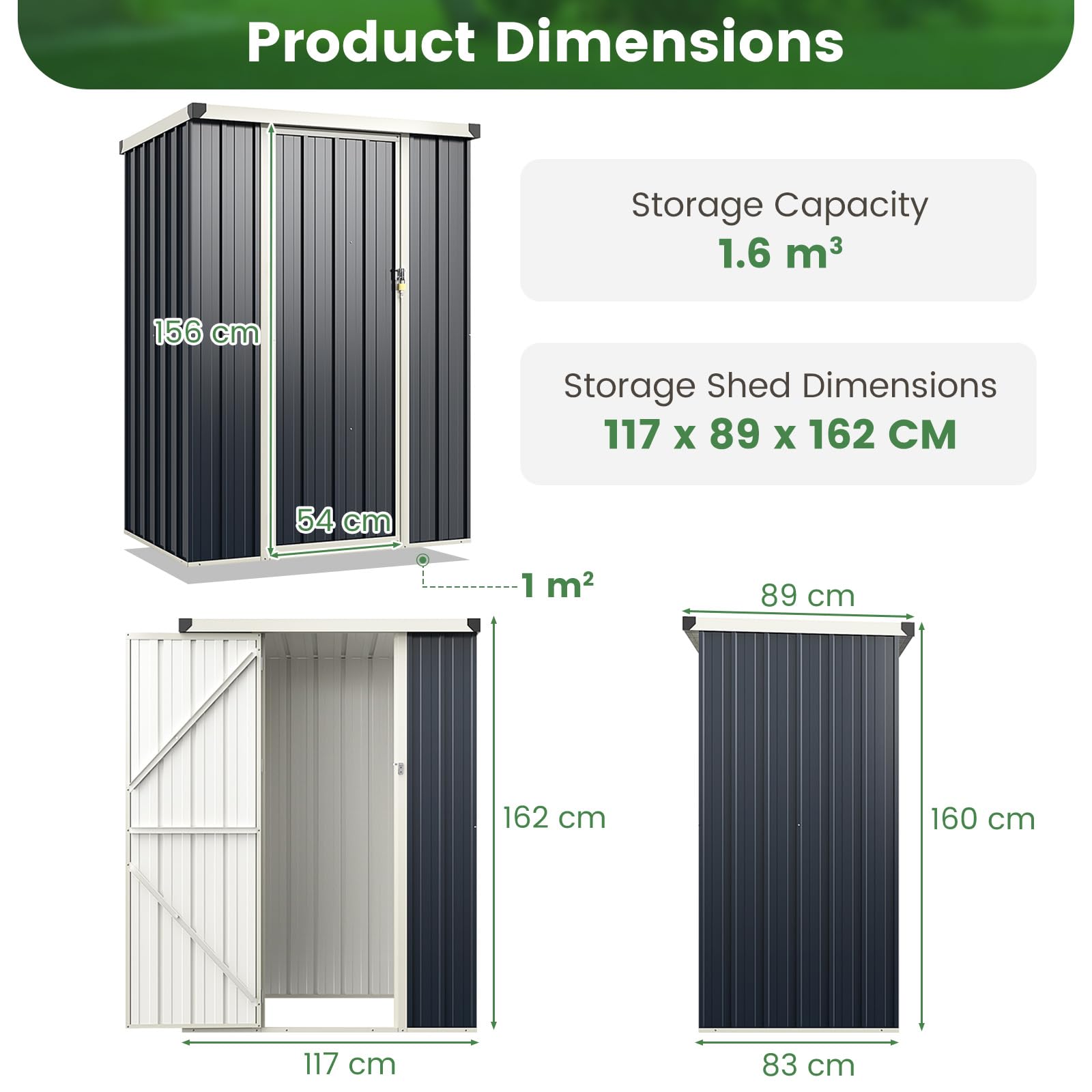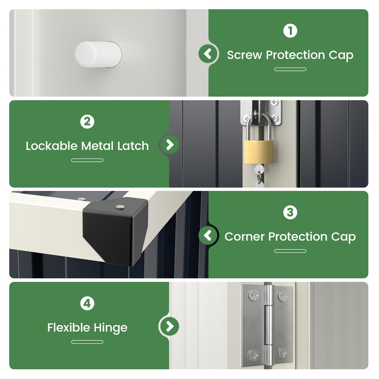 Our metal outdoor storage shed dimensions are 117 x 89 x 162 CM (L x W x H), providing ample space for storing tools, garbage, miscellaneous items, or even a cozy shelter for your beloved furry friend. Crafted of durable and weather-resistant galvanized color steel material, this metal shed is designed to withstand rust, sun exposure, and various weather conditions. For enhanced stability and safety, it can be anchored on a concrete base (includes expansion screw kits) or a wooden base (the anchoring kits are not included). Thanks to its snap-on structure, this upgraded storage shed could simplify the installation process with 50% reduction in screws. Experience the simplicity and functionality of our metal outdoor storage shed for all your storage needs.