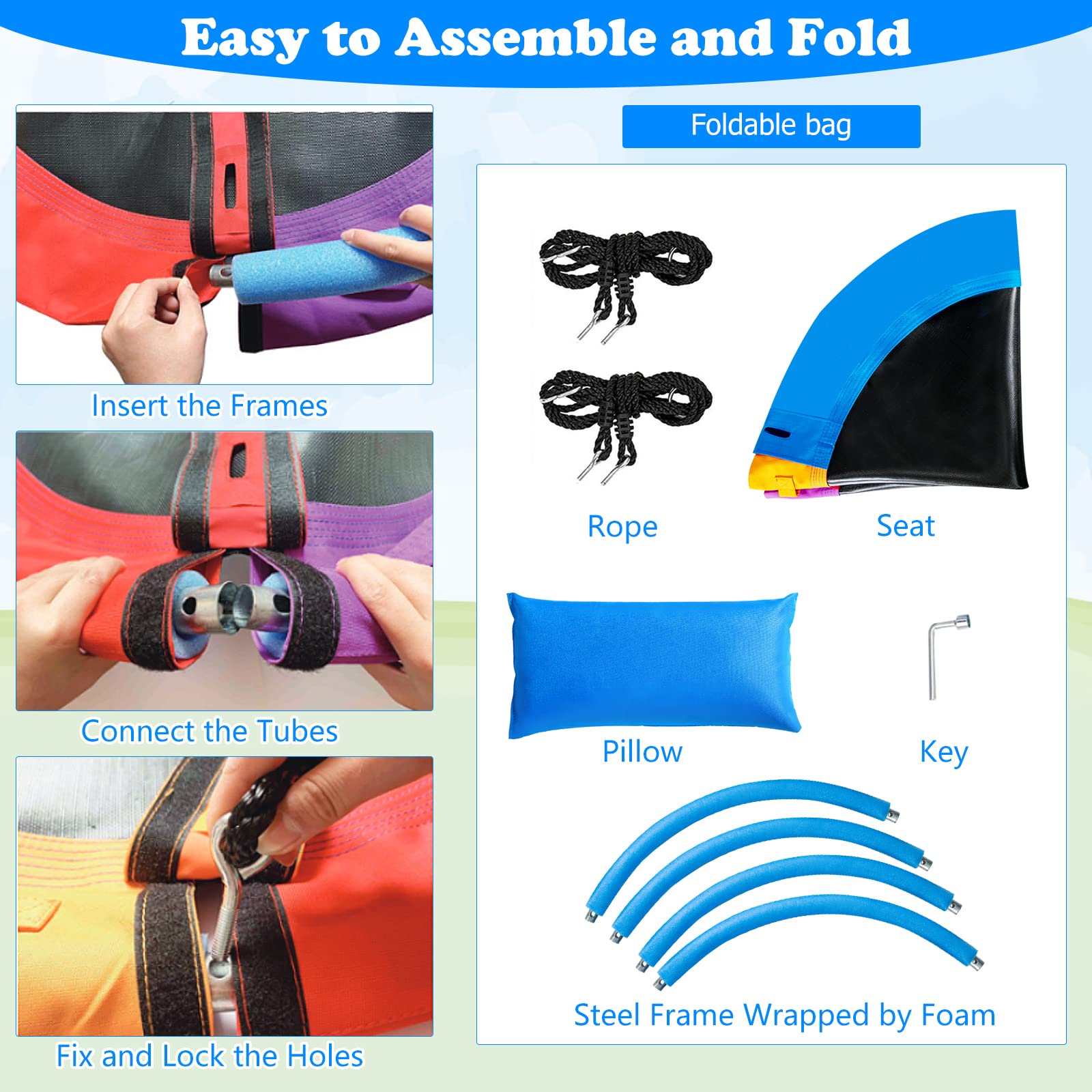 - Adjustable Rope for Free Combination: You can freely adjust the height of the swing between 100 and 180 cm to meet different requirements. In addition, any combination of connection modes can give children different playing experiences, and they can swing back and forth or rotate left and right.