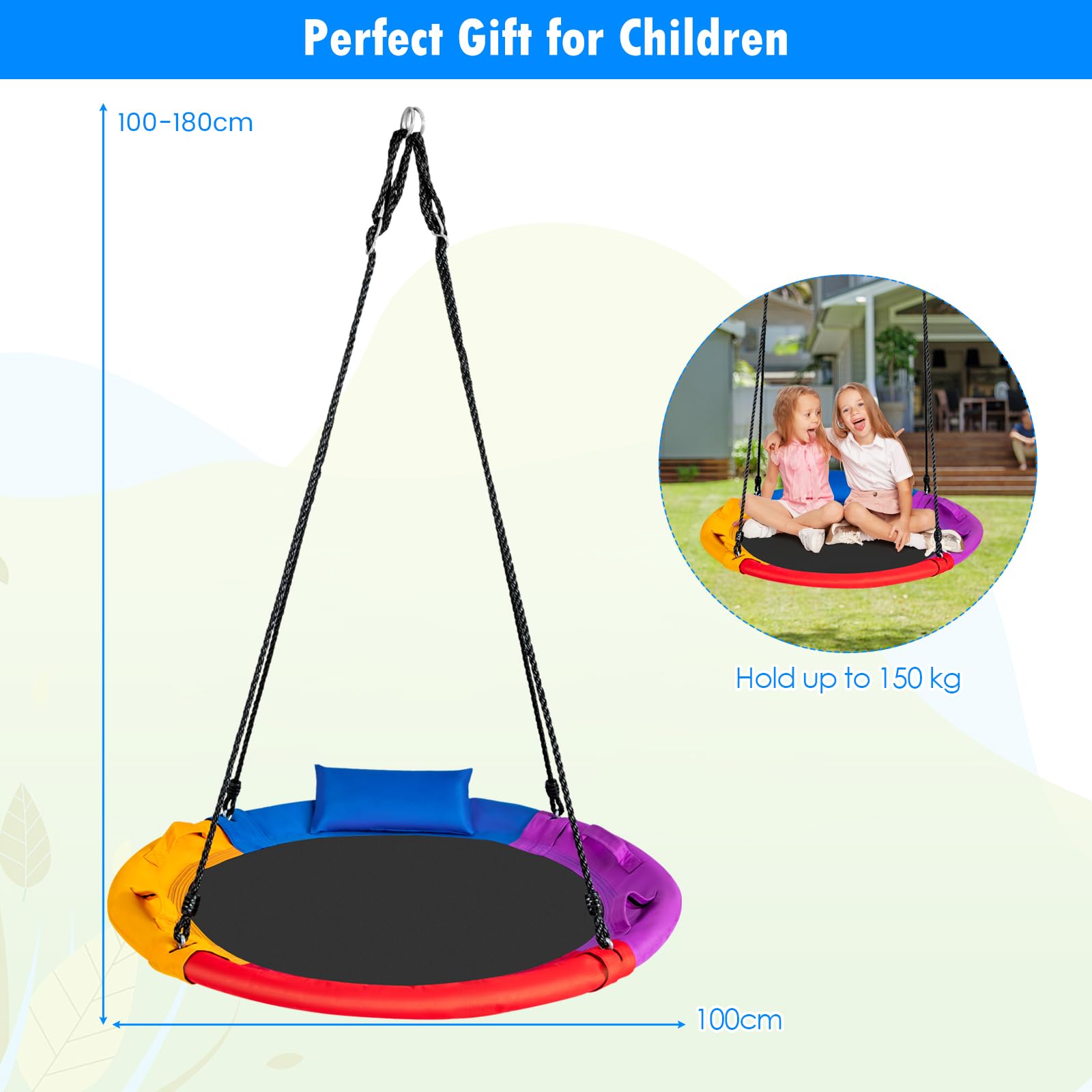 - Comfortable And Safe Design: Our round nest swing comes with a pillow and four side handles so that children can lie down and rest or hold the handle during entertainment to ensure safety. More than that, the pillow is fixed by hook and loop to facilitate disassembly and cleaning.