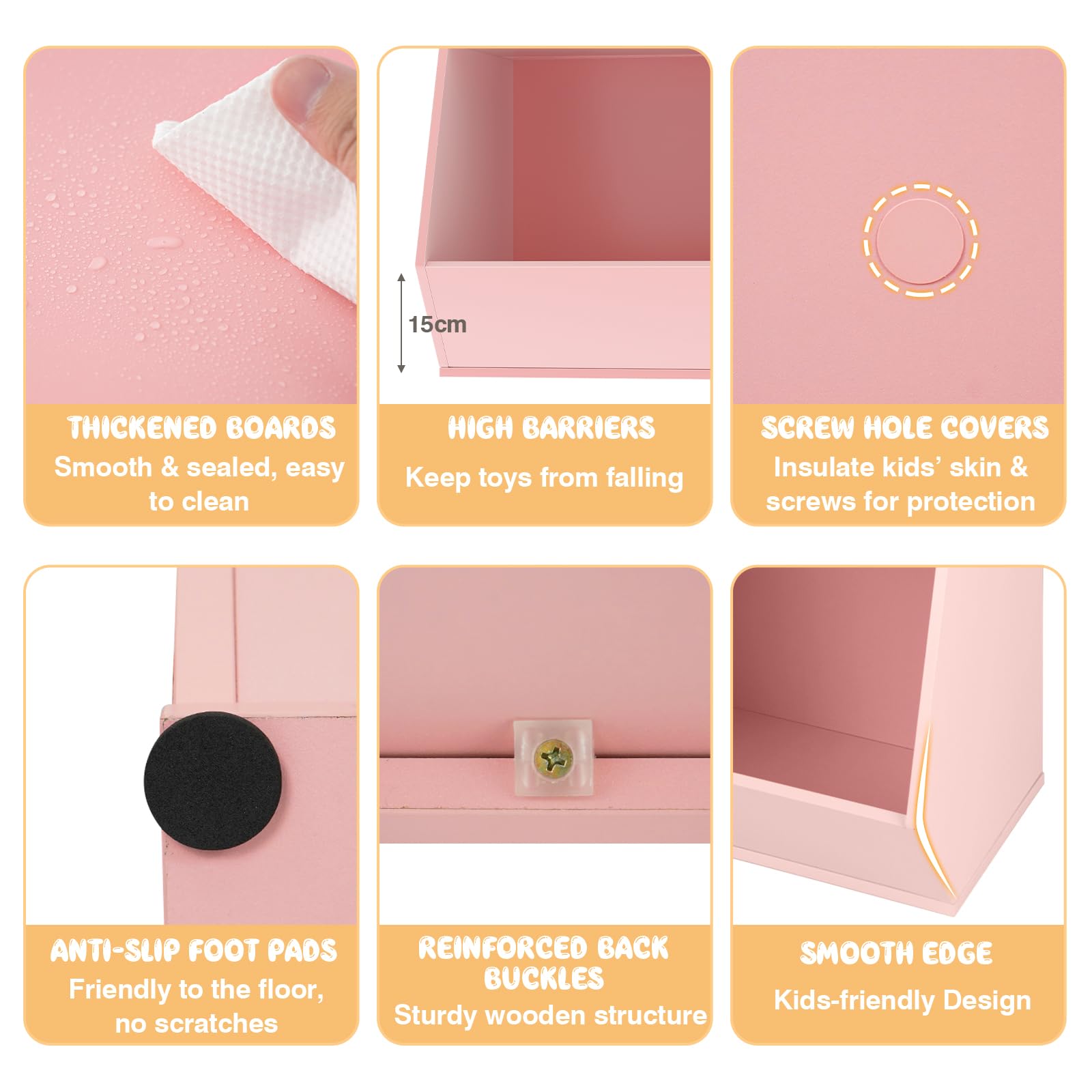 High Quality Material and Stable Structure: The wooden storage shelf is made of high quality thickened boards, which has great strength and safety. The stable structure allows the top of the shelf to hold 50kg. Besides, the reinforced back buckles and anti-slip foot pads also make this kids bookcase more stable on the floor.