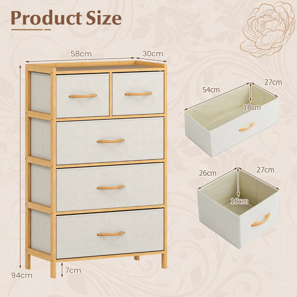 Ample Storage Space: Featuring a spacious wide top and 5 removable fabric drawers, this 5-drawer bamboo dresser offers you an abundance of organized storage for clothes, accessories, or household essentials.