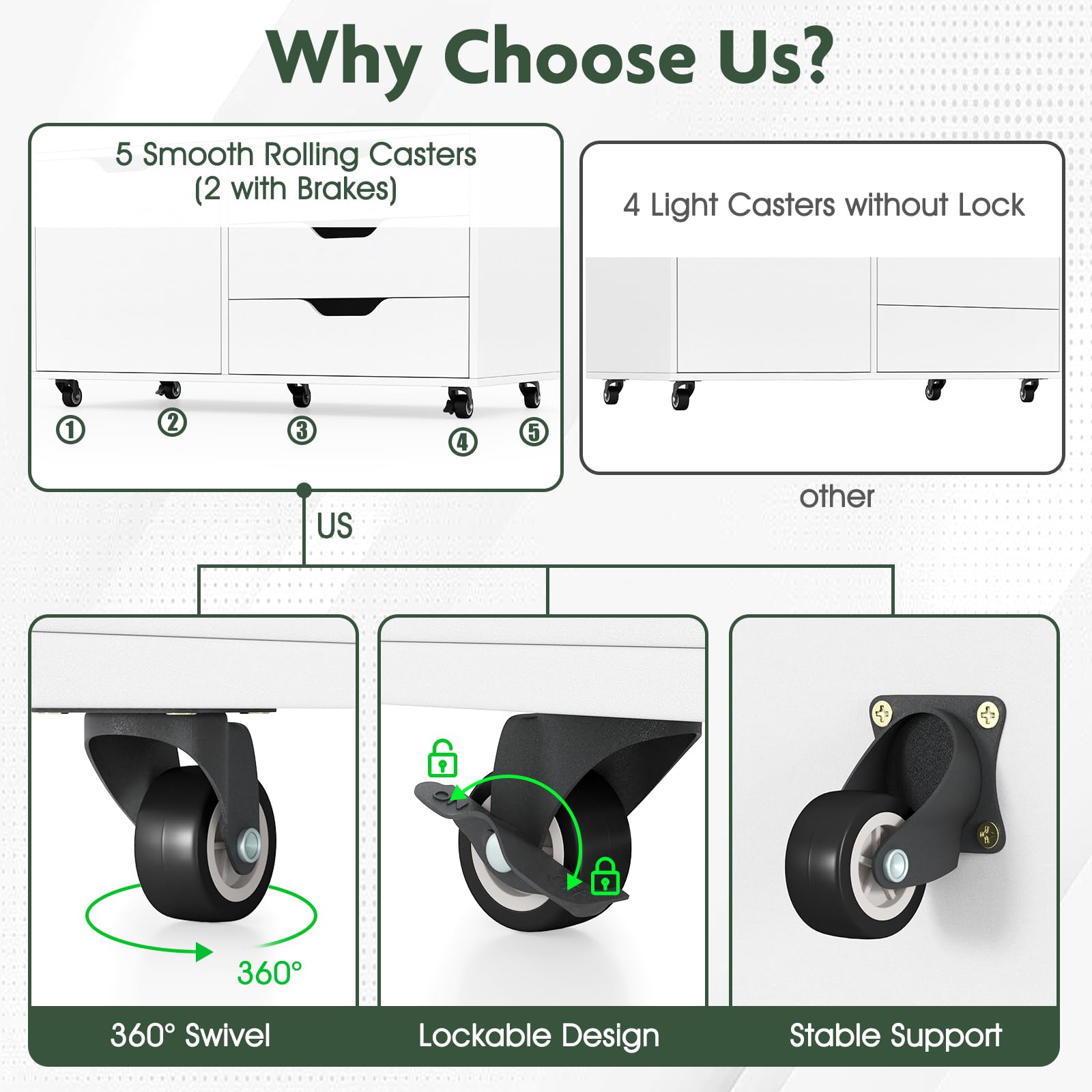 Enhanced Mobility & Stability: Equipped with 5 sturdy metal casters, this mobile chest of drawers ensures easy movement around your space. 2 casters have brakes to keep the file cabinet in place, while the middle one provides stable support.
