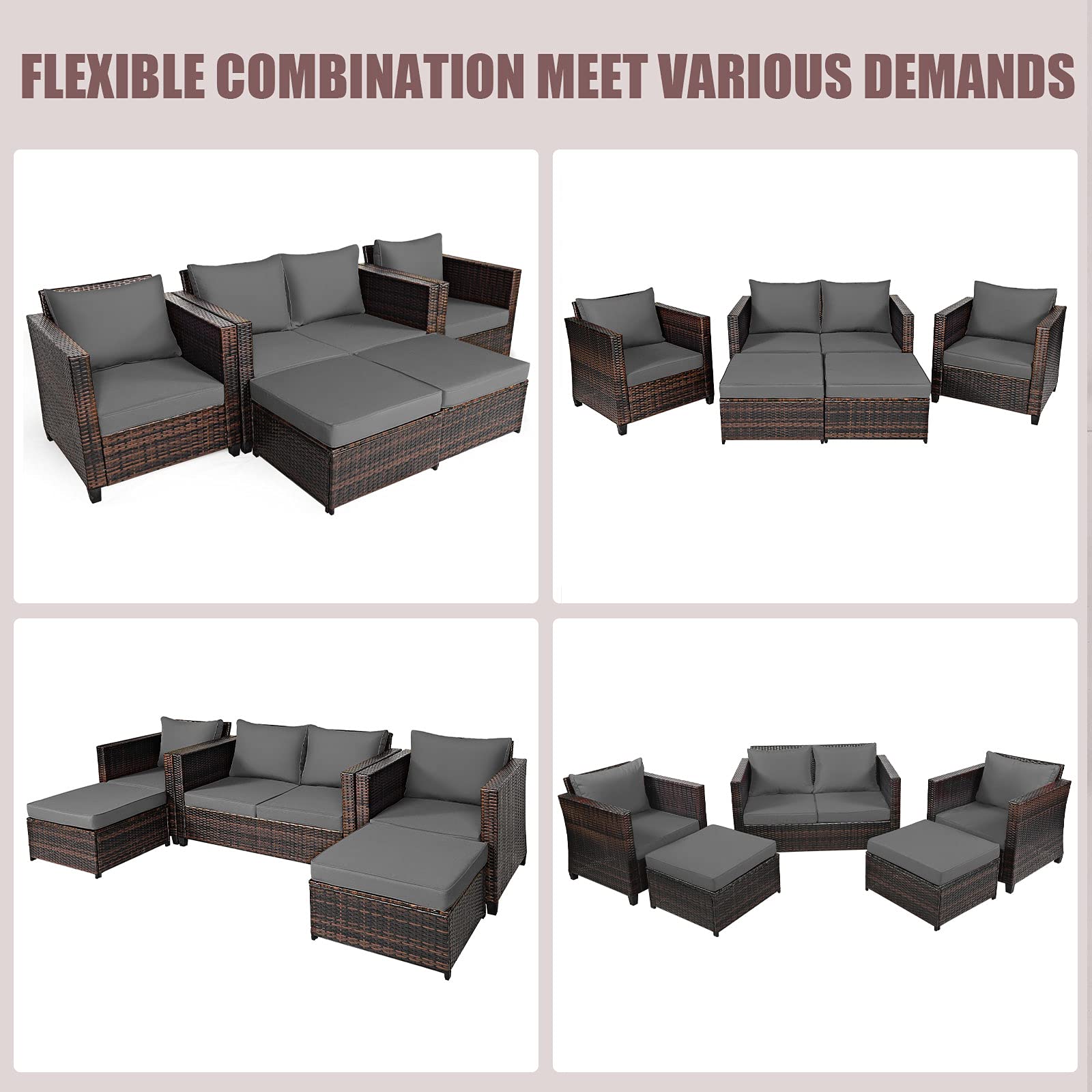 This 5-piece wicker patio furniture ensemble consists of a loveseat, 2 individual sofas, and 2 ottomans, offering an excellent option for your relaxation needs. Its versatile design makes it suitable for use on balconies, decks, backyards, porches, and poolside areas. Constructed with a robust metal frame and covered in PE rattan, each sofa and ottoman are built to withstand prolonged use. Complete with 6 soft cushions and 4 pillows, this outdoor furniture set ensures a comfortable seating experience.