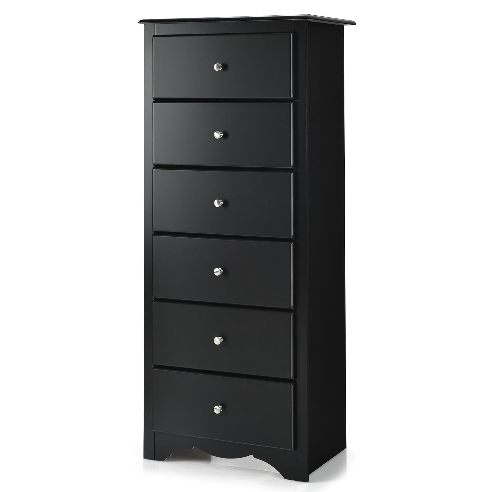 This drawer chest is not only elegant, but also practical. Concise lines, glossy surface and unique waved bottom make it a wonderful decoration in your home. Classic style and simple design allow it to blend with any home decor perfectly. Besides, featuring 6 drawers and a spacious top, this cabinet provides large storage space for your multiple items: books, magazines, toys, clothes, plants, artworks and more. Exquisite drawer knobs and smooth slides facilitate your access to the items. As for the quality, this cabinet is made of high quality p2 grade MDF, which ensures strong stability and durability for long lasting use. In addition, the back of this chest is equipped with an anti-reverse device to fix the cabinet to the wall for safe use. A multifunctional storage cabinet for your bedroom, living room or entryway!