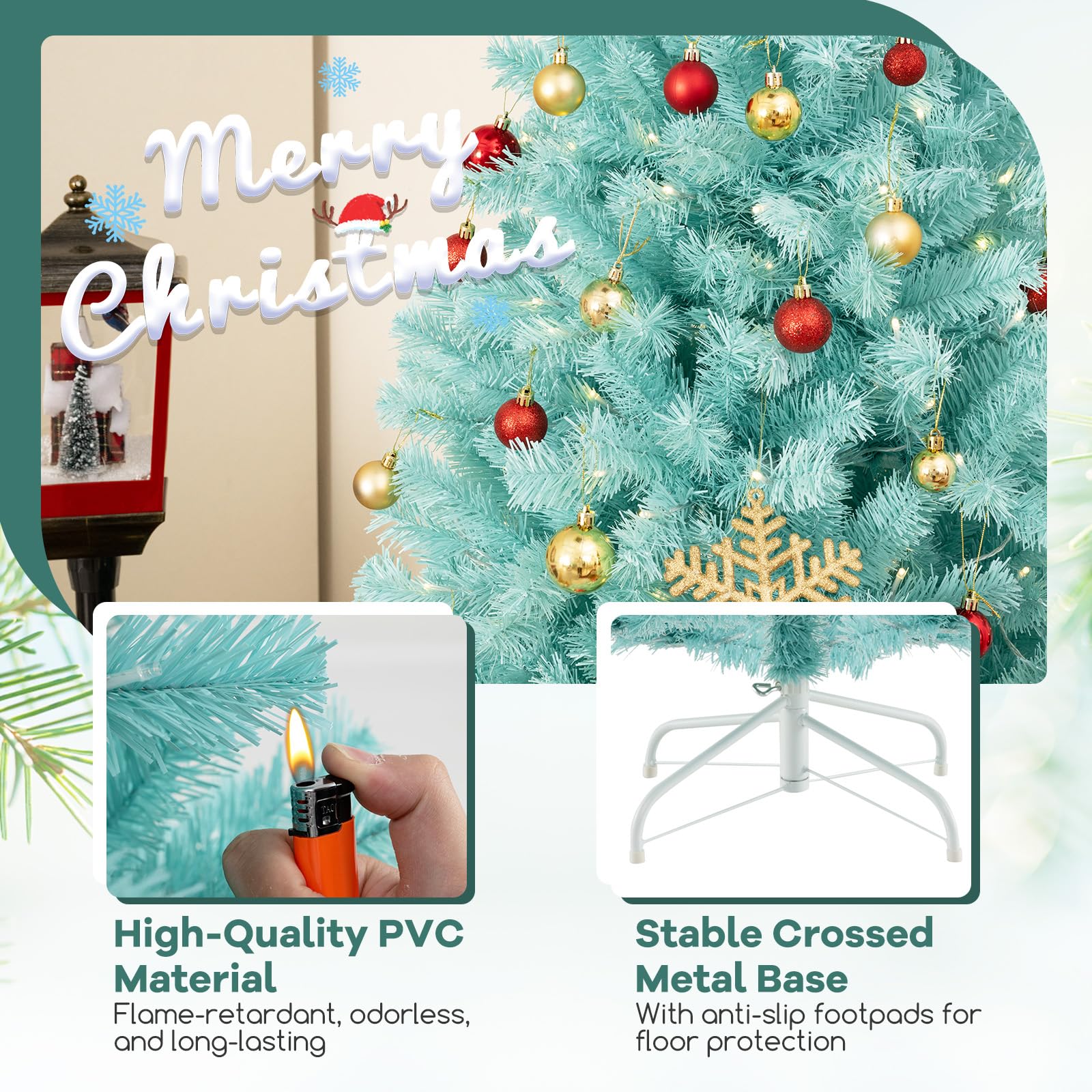 Safe and Enduring PVC: The artificial tree is crafted from 100% new PVC, a fireproof, non-allergic, and smell-free material that ensures your holiday season is worry-free. In addition, its anti-fading property means the tree will retain its vibrant colors.