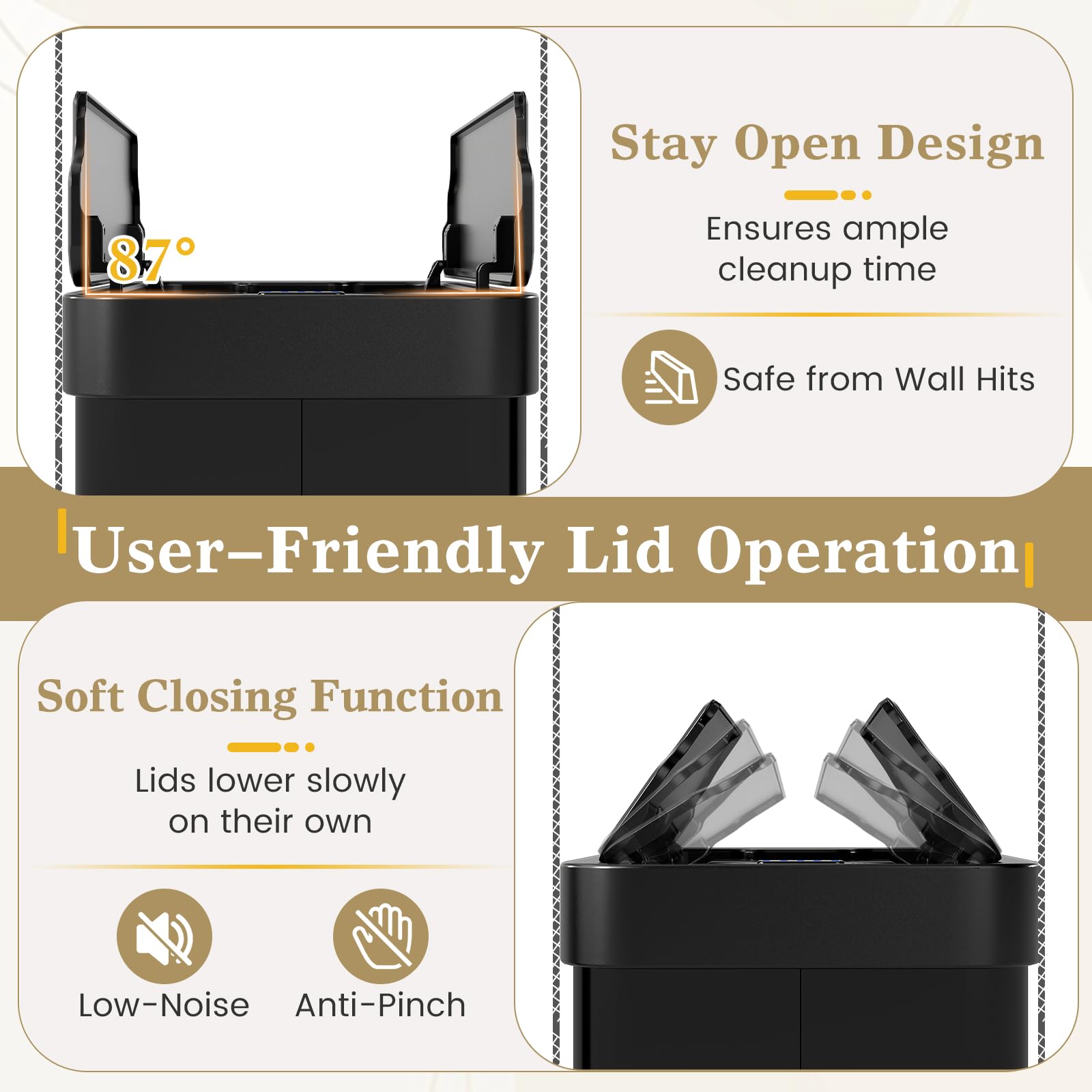 Anti-collision pads reduce noise from the lids opening and closing