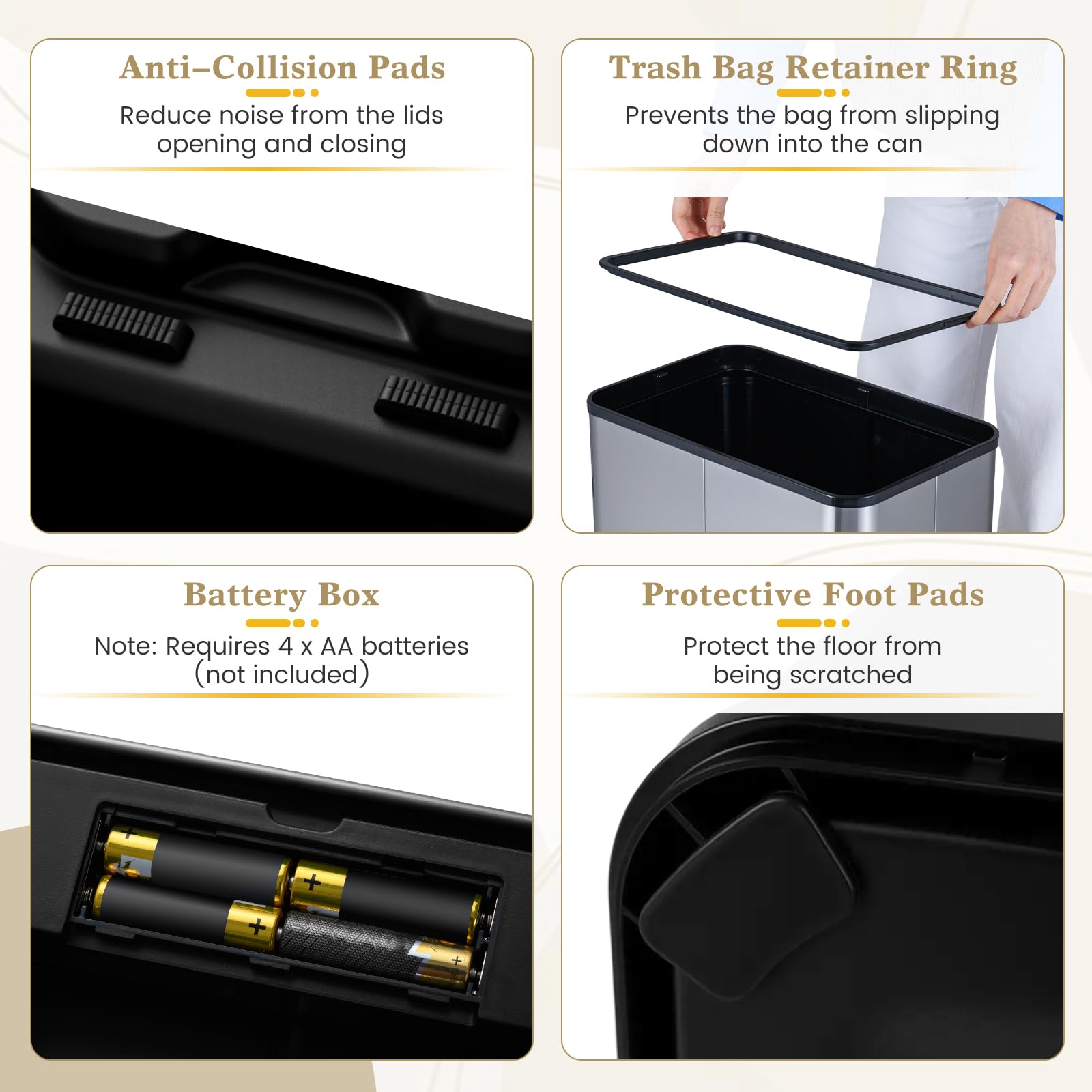 Experience effortless waste disposal with this smart motion sensor garbage bin, featuring 0.3s quick response from its infrared sensor detecting motion from 15-25 cm away. The fully open wing lids prevent the stuck single lid issue, allowing smooth and user-friendly lid operation. After opening, the lid ensures 5s automatic closing, keeping your space clean. Designed with an 87° stay-open angle, it is safe from wall hits, while the low-noise and anti-pinch soft-close lid glides shut quietly and securely. Its slim profile fits perfectly under low countertops, making it ideal for kitchens, bathrooms, or offices. Constructed from robust 3-layered stainless steel, this trash can is rustproof, stain-proof, and well-sealed to lock in unpleasant smells effectively. Note: requires 4 x AA batteries (not included). With protective foot pads and a secure trash bag retainer ring, this space-saving bin combines practicality and convenience for everyday use.