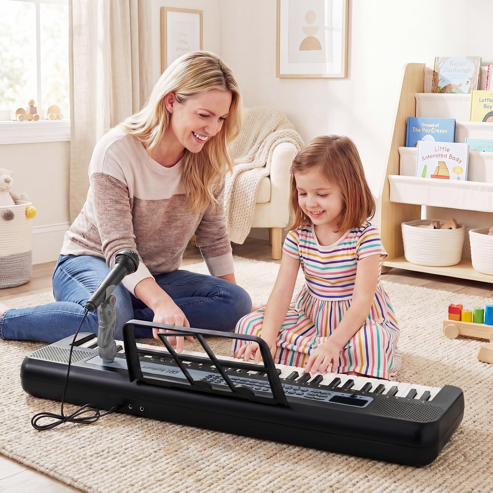 Realistic Kids Piano Keyboard: Featuring 61 keys and functional buttons, the children piano keyboard offers 8 drum sounds, 20 demos, 200 rhythms, and 200 tones. Your little musician can also adjust the volume and speed. It also features functions of recording, playing, and chord. Plus, the microphone allows kids to sing along.