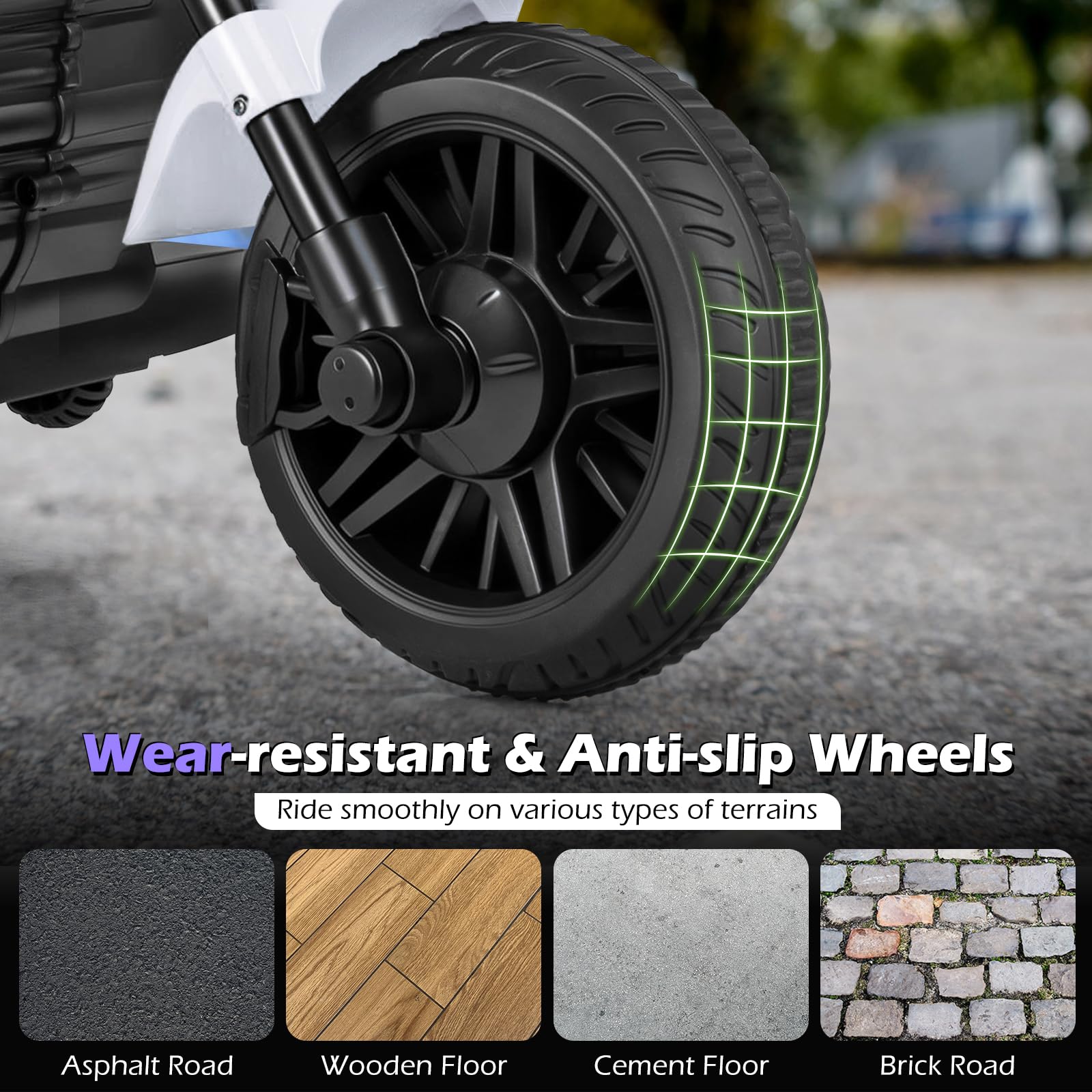 Description: Spark your child's sense of adventure with this 6V electric motorcycle! Designed for exciting yet safe rides, the enduring tires and anti-tipping wheels for added stability. A simple switch activates easy start-up and allows switching between forward and backward movements. The adjustable handlebars and foot pedal help develop hand-eye-foot coordination. Bright LED headlight and music make every ride more fun and engaging. Perfect for birthdays, holidays or other special occasions, this kids motorbike is an excellent choice for both boys and girls.