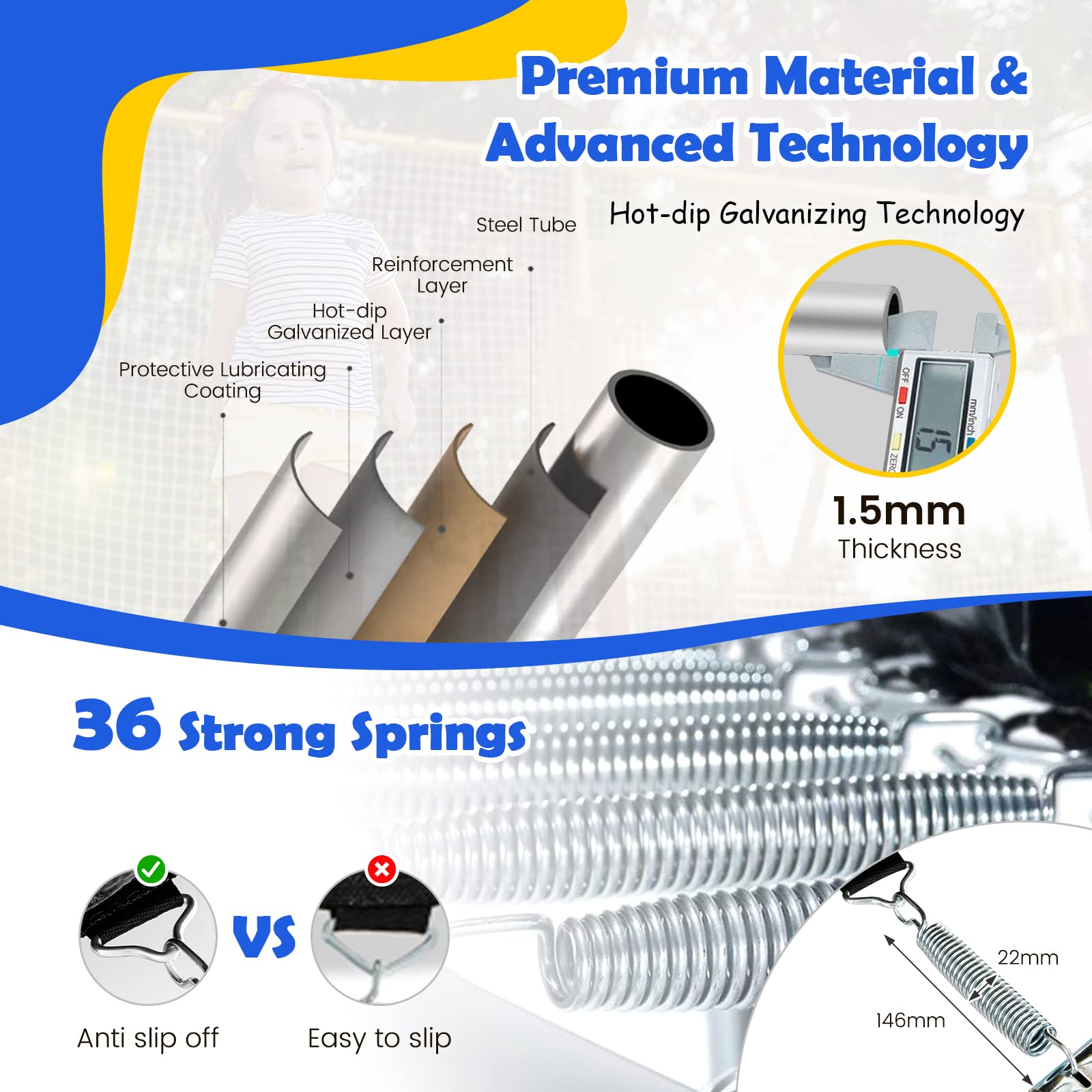 Unparalleled Bouncing Experience: With a premium PP jumping mat, toddlers can have a better bouncing experience. What's more, the 36 pcs high-strength springs as well as the tear-resistant stitches ensure safety. The seamless design between the jumping mat and protective cover prevents kids' hands and feet from getting stuck.