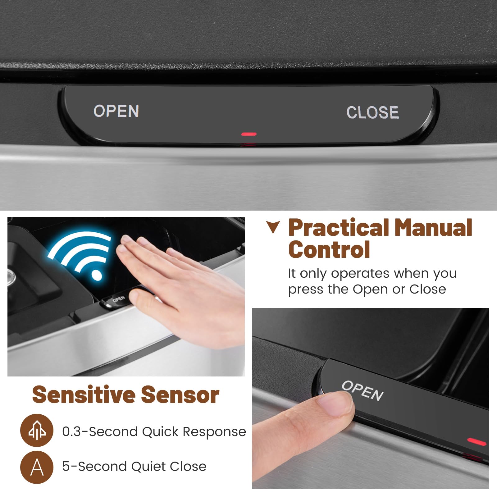 Introducing the innovative touchless motion sensor waste bin, designed to simplify waste disposal in style and convenience. This cutting-edge 72L trash can opens automatically in a swift 0.3 seconds upon detecting motion, offering a hands-free experience. It boasts a 46.5L upper compartment and a detachable 3.5L kitchen waste bin for efficient waste management. The thoughtfully crafted dual pull-out system provides 2 small removable trash cans of 11L, allowing for seamless recycling. Experience ultimate ease with the stay-open lid feature and gentle soft-closing mechanism, ensuring quiet and hassle-free operation. Crafted from a durable 3-layered stainless steel construction, this trash can resists fingerprints and offers exceptional longevity. Complete with anti-slip foot pads, this trash bin ensures floor protection.