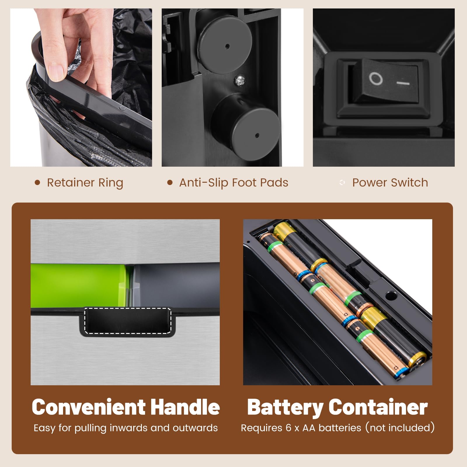 Sensitive Motion Sensor: Easily discard waste without touching the trash can, thanks to the advanced motion-sensing technology that opens the lid automatically within 0.3s of sensing your hand. By the way, it needs 6 x AA batteries (not included).