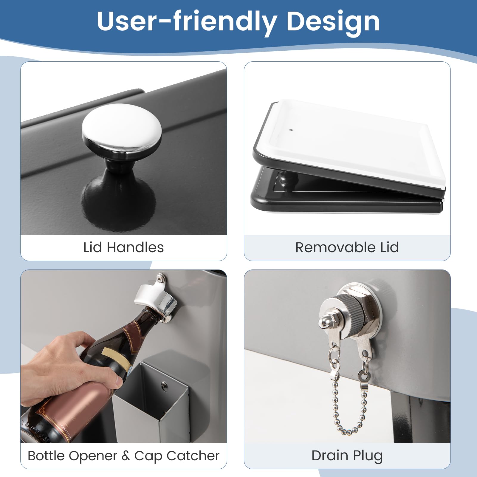 User-friendly Design: This rolling ice chest is designed with practical features including a built-in bottle opener, a cap catcher and a drain plug. What's more, the removable lid with 2 lid handles can be easily opened and closed from both sides.