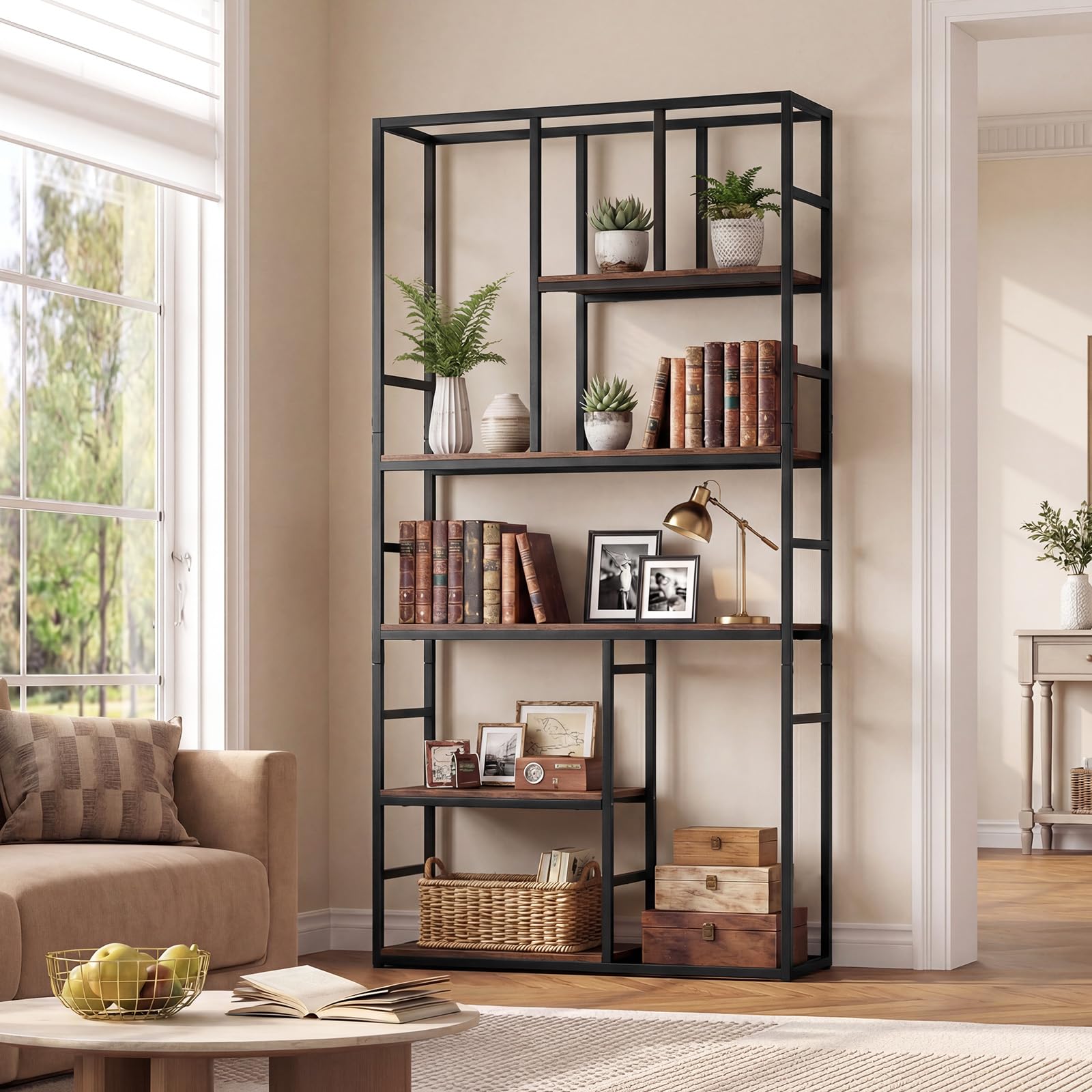 This freestanding bookcase stands 180cm high and features a rustic brown and black shelving unit that adds a retro touch to your room. Its sturdy metal construction and anti-slip pads provide reliable support and stability, making it both practical and safe. The 5-tier open display shelf allows you to neatly organize and effortlessly access your items, enhancing your living space with a versatile retro storage organizer. Additionally, equipped with 2 anti-toppling devices, this storage organizer ensures enhanced safety while seamlessly fitting into your home office, living room or bedroom.