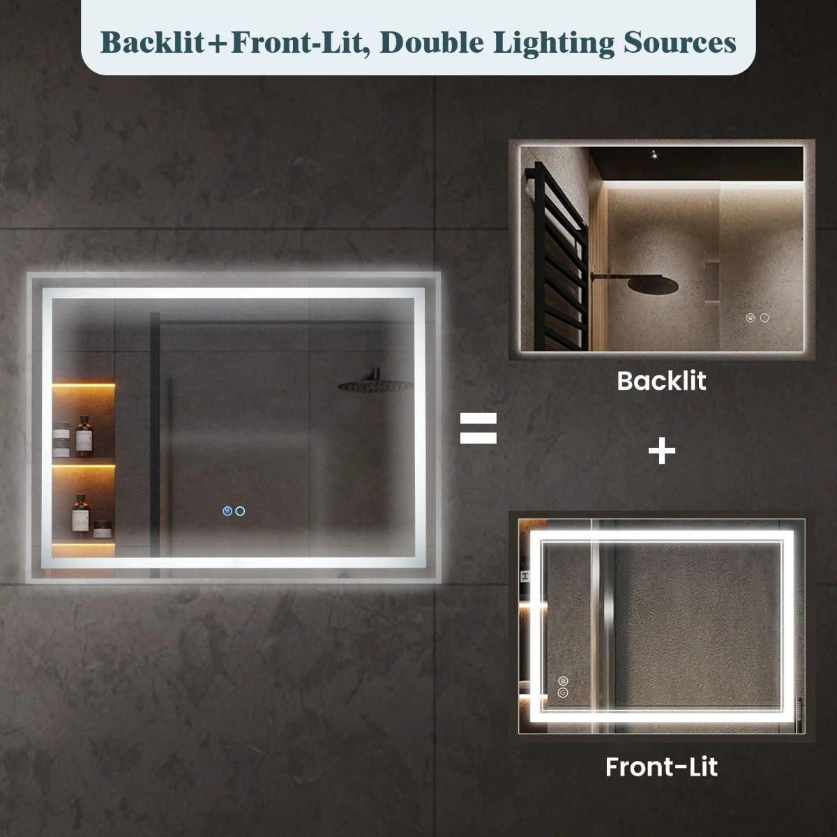 Backlit+Front-Lit, Double Lighting Sources: This lighted mirror features dual lighting system, equipped with both frontlit and backlit settings. This feature allows light to come not just from the front for clarity but also softly from behind, creating a beautiful ambiance.