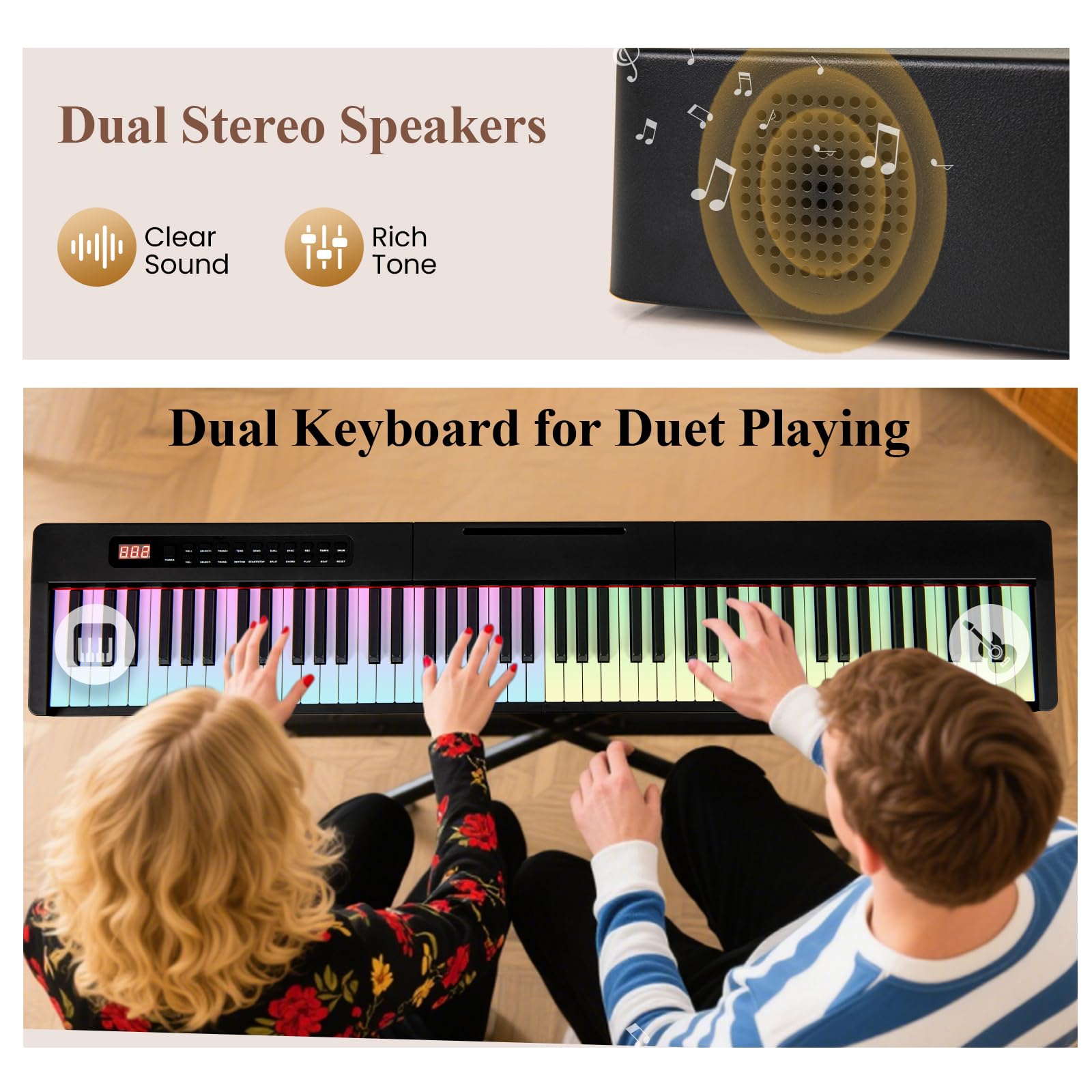 Dual Keyboard for Duet Playing: You can press the " Split " button to enter the split tone selection mode to divide the keyboard into 2 parts (left and right). The split function allows 2 players to play simultaneously, making it perfect for learning music lessons or duet playing.
