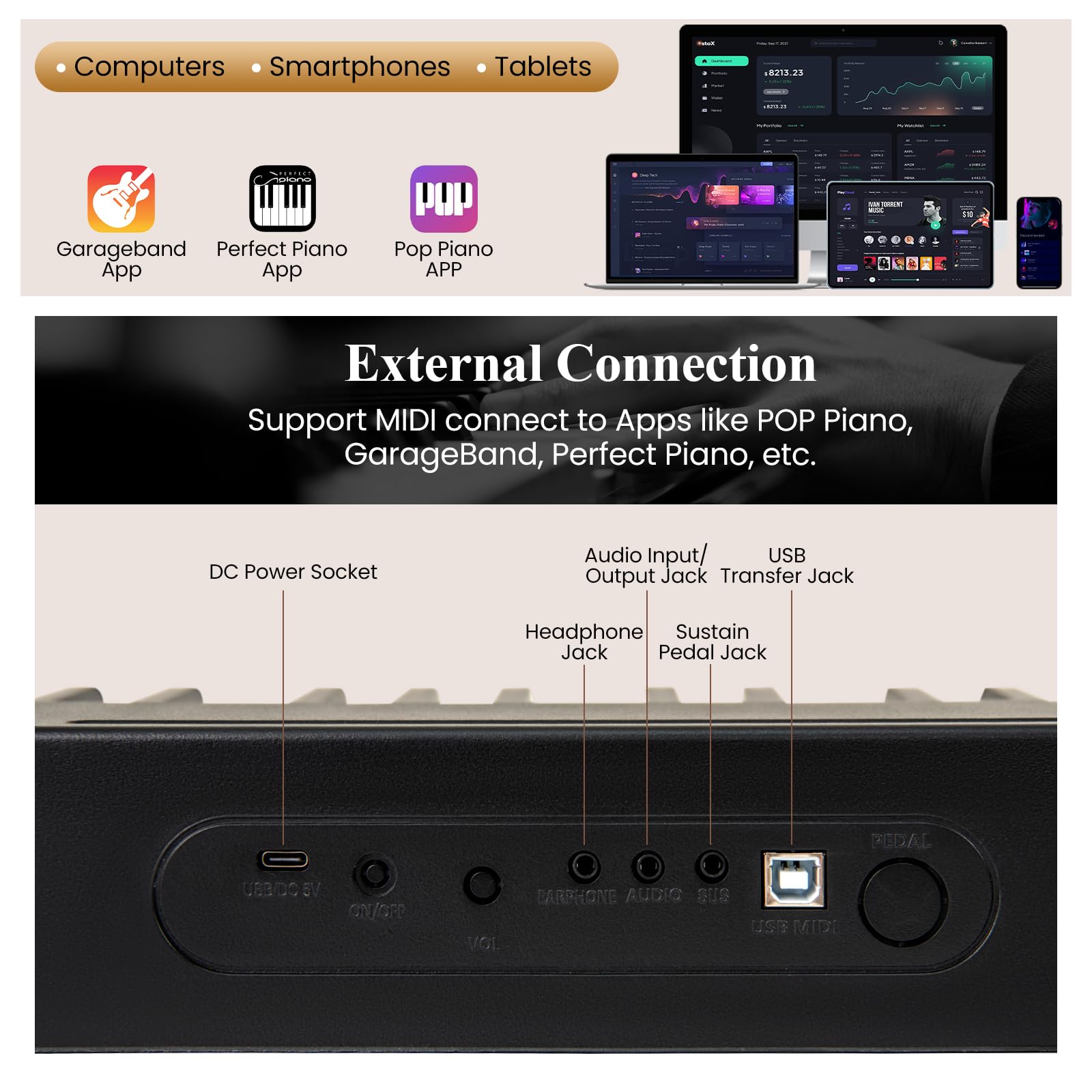 External Connection and Power Supply: There are different jacks that can be compatible with power, headphones, pedals, and other audio devices. It can also support MIDI connect to Apps like POP Piano, GarageBand, Perfect Piano, etc. The keyboard features dual power supply modes: 5V power adapter or 3.7V 2600mAh rechargeable battery.