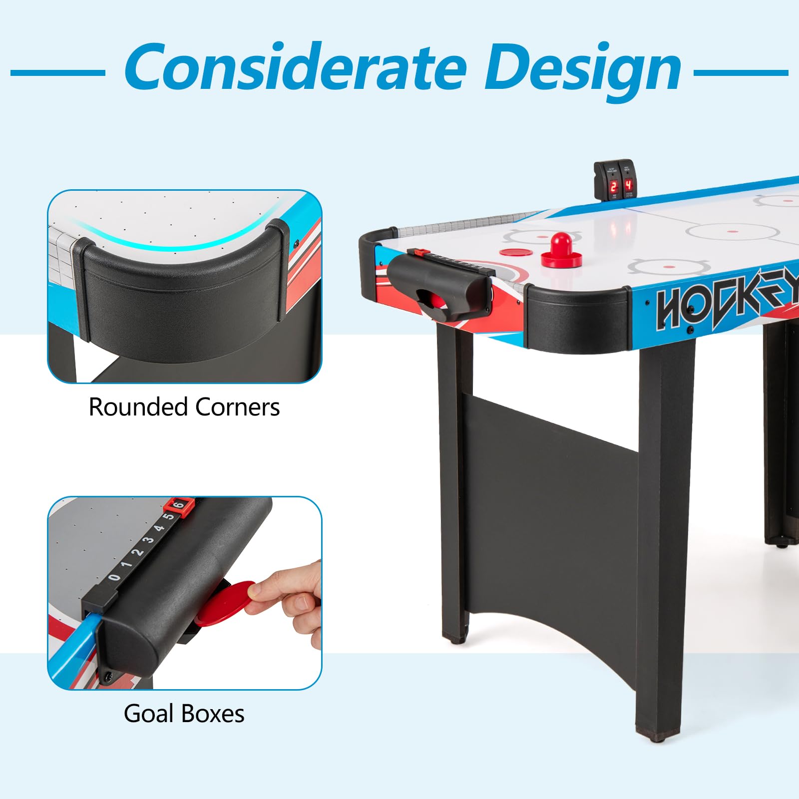 Considerate Design: This arcade style hockey table is equipped with rounded corners to prevent bumps or scratches during energetic play, enhancing safety. Plus, the goal boxes ensure the smooth return of pucks, providing a seamless gaming experience.