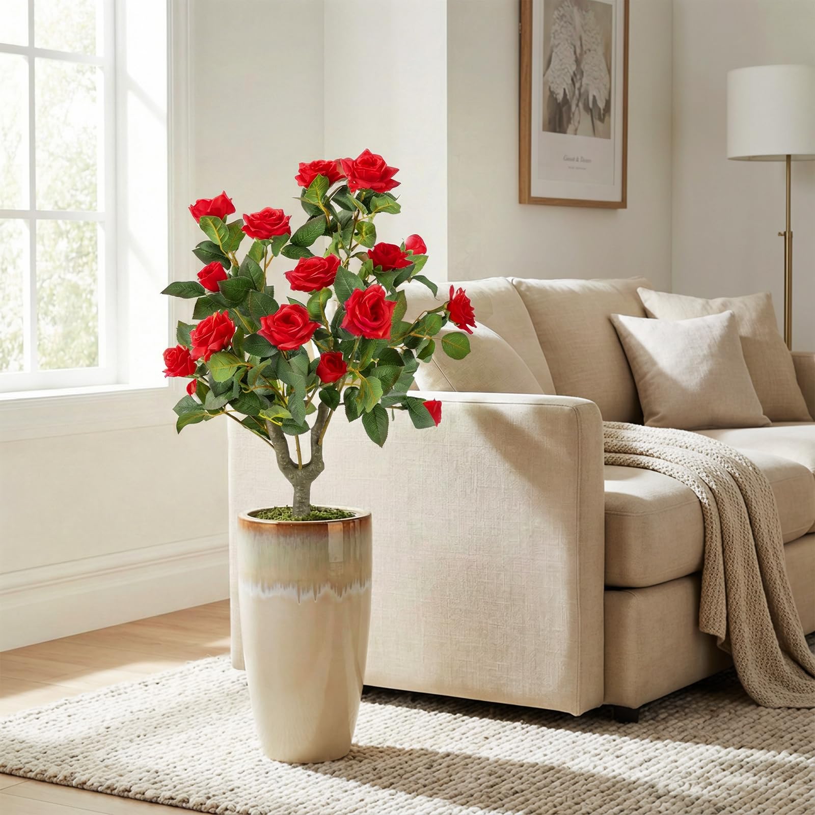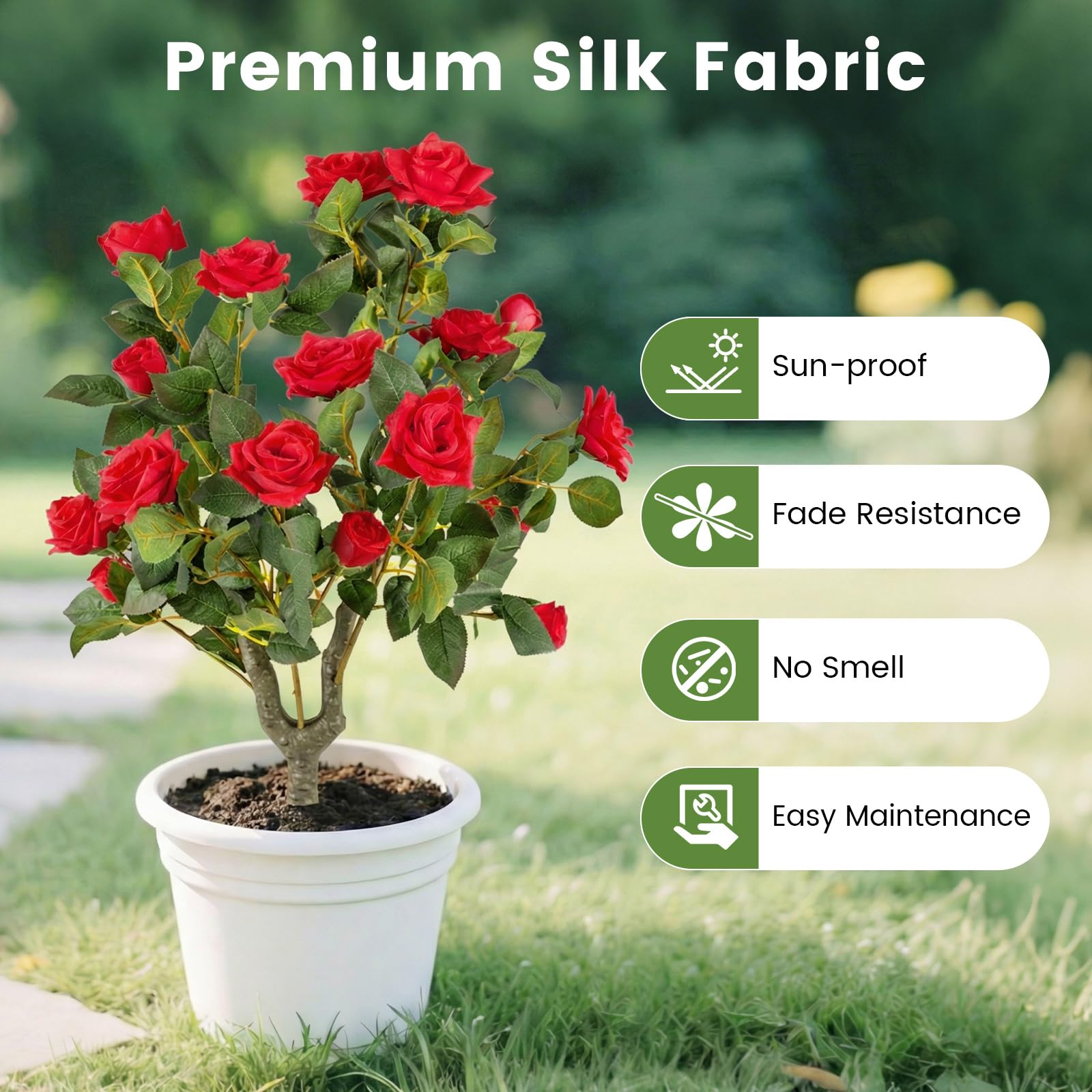 18 vivid Red flowers & 186 leaves create a realistic and dense appearance