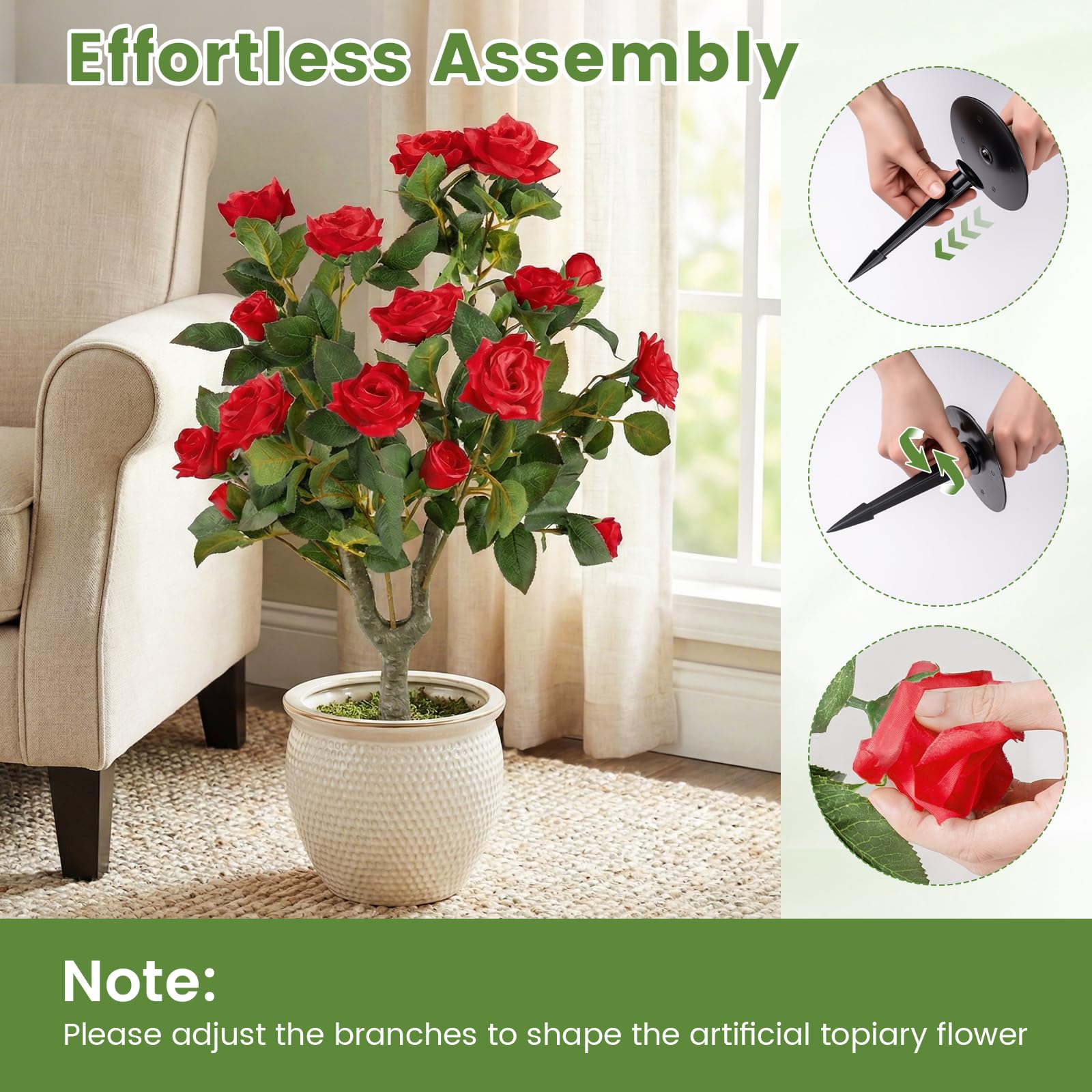 The artificial floral plant features a lush arrangement of 18 realistic Red blossoms and 186 detailed leaves, offerings a naturally dense and striking appearance that enlivens any setting. Crafted from premium silk fabric, each petal is designed for exceptional fade resistance and reliable sun protection, ensuring beauty that lasts season after season. Supported by a rustproof aluminum alloy spike, this decorative tree stands steady whether placed in a planter or anchored directly into the ground. Assembly is effortless and tool-free, while ongoing care is as simple as an occasional wipe clean. Therefore, the faux topiary flower tree is perfect for brightening front porches, gardens, or living spaces. Please adjust the branches to shape the artificial topiary flower.
