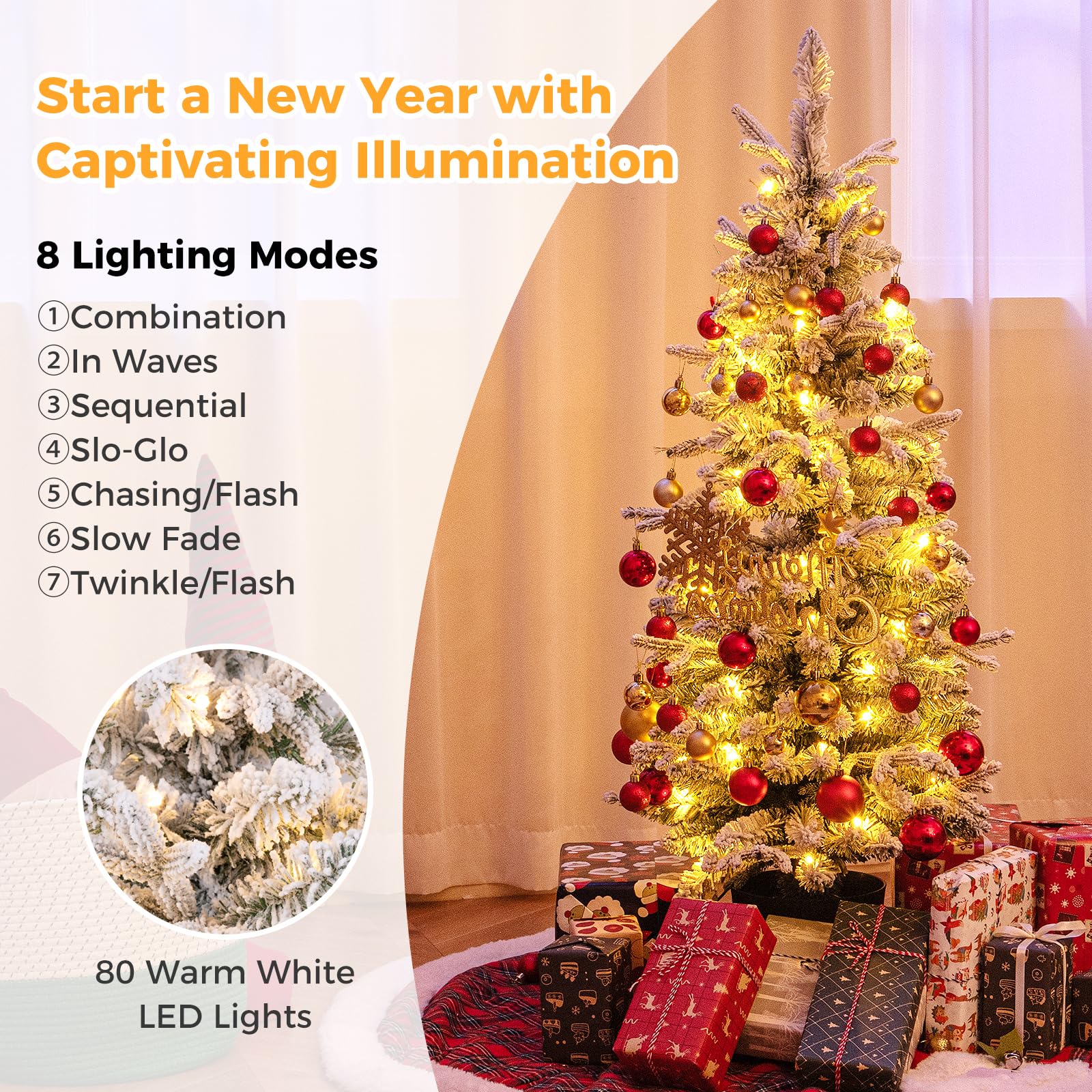 Boasting 176/249/334 snow flocked branch tips, the pencil Xmas tree exudes frosty elegance. Moreover, the branch tips feature a bullet-shaped design for a unique appearance. Adorned with 80/120/140 LED lights, the artificial Christmas tree allows you to star a new year with captivating illumination. Additionally, the 8 lighting modes, including slow fade, twinkle/flash, chasing/flash, slo-glo, in waves, sequential and combination will bring fresh experience to you. With the combination of PE and PVC materials, the light-up holiday decoration tree is non-fading, long-lasting and realistic, allowing for years of usage. Coming with a planter that is filled with cement for added stability, the snow-flocked Xmas tree is less prone to wobble. Moreover, thanks to its slim shape, the potted Christmas tree can be displayed in anywhere you want!