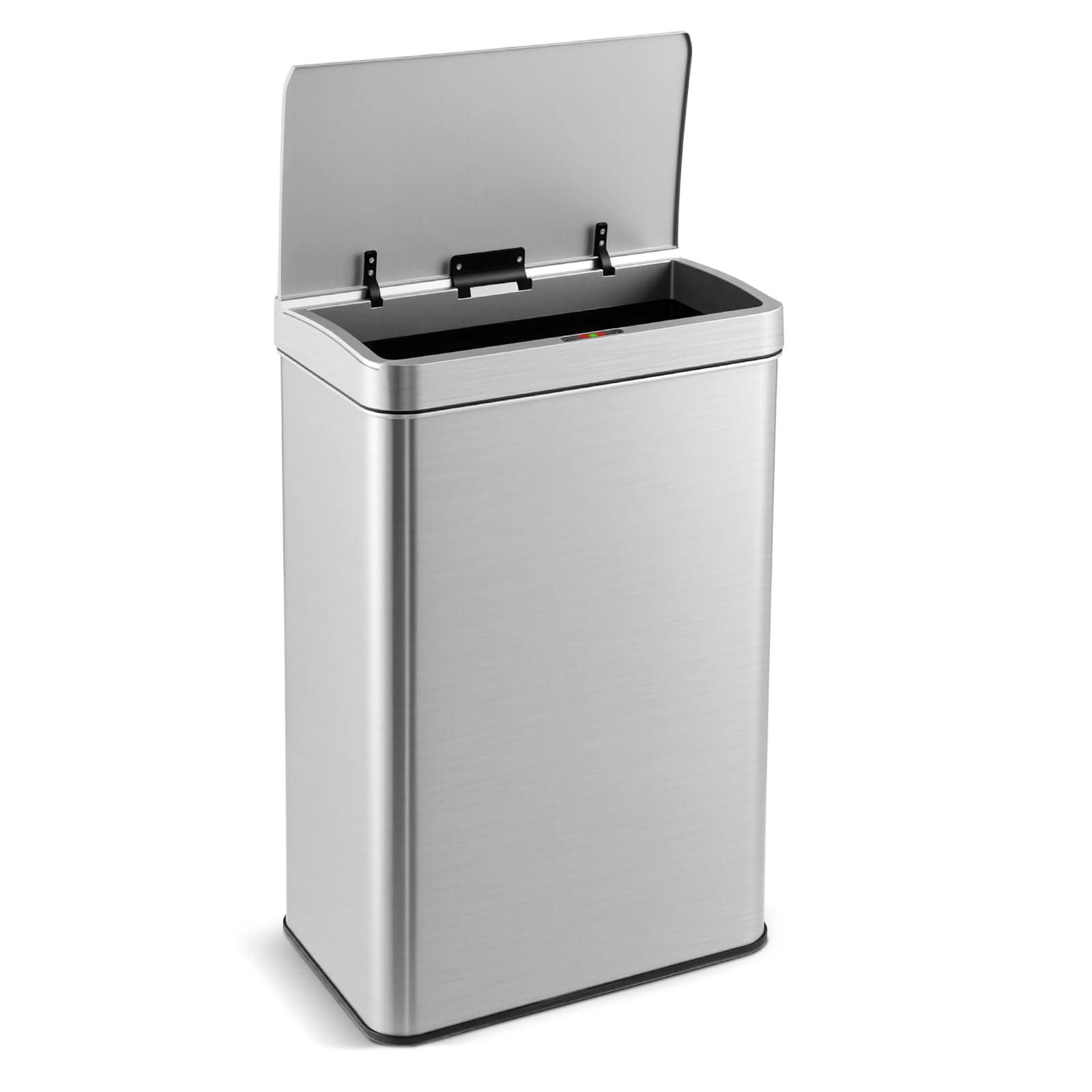 Stainless Steel Structure: The motion sensor trashcan features a 3-layered stainless steel structure. It includes a fingerprint resistant layer to keep it looking pristine, and a stainless steel layer for durability. It is waterproof and designed for easy cleaning.