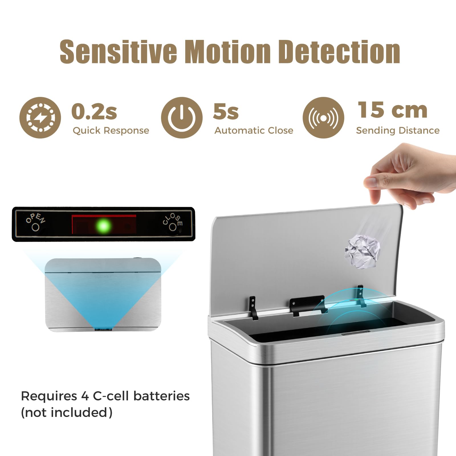 Sensitive Motion Sensor: The stainless steel trash can boasts a sensitive motion sensor that responds in just 0.2s, ensuring quick access. It automatically closes after 5s, maintaining cleanliness. Note: It is powered by 4 C-cell batteries (not included).
