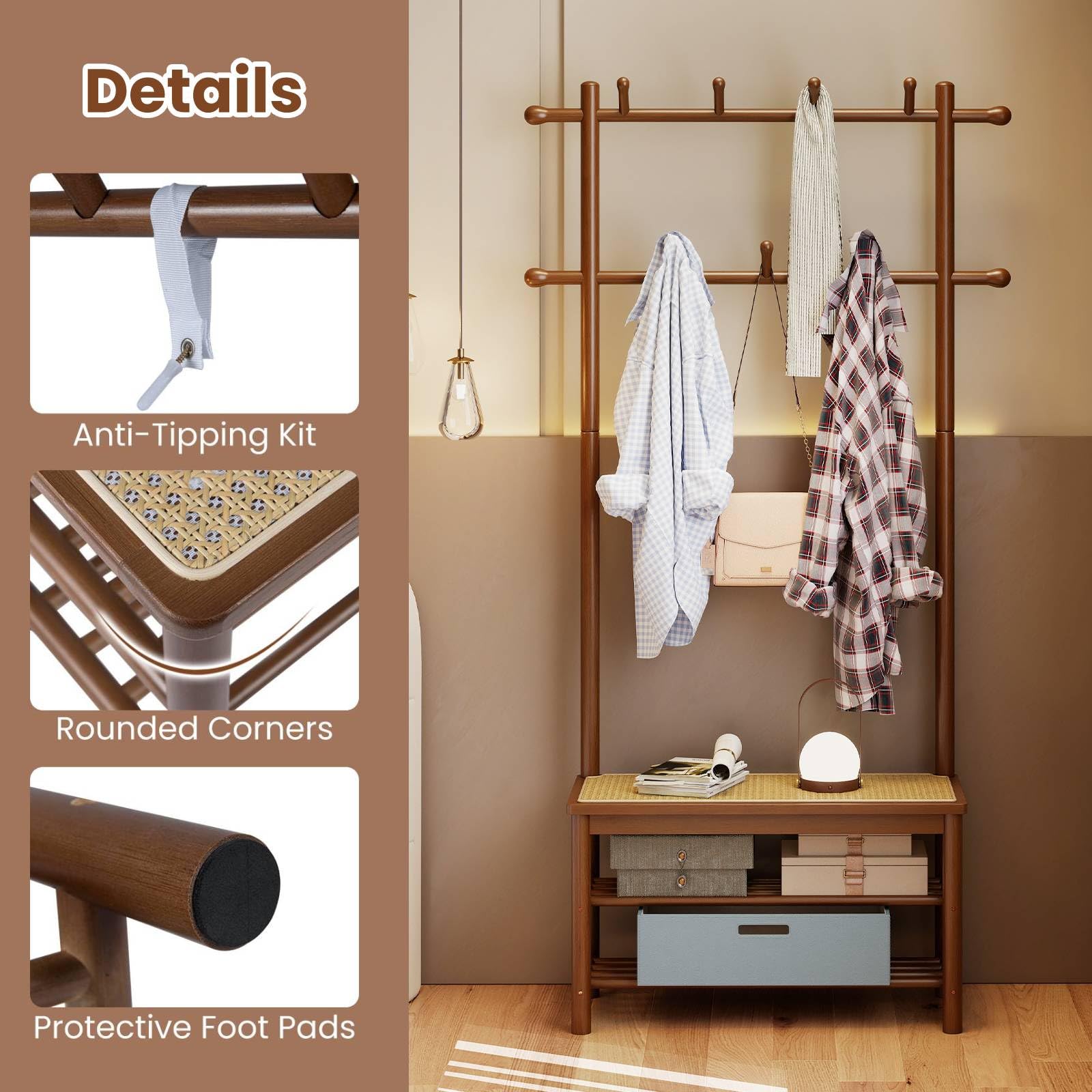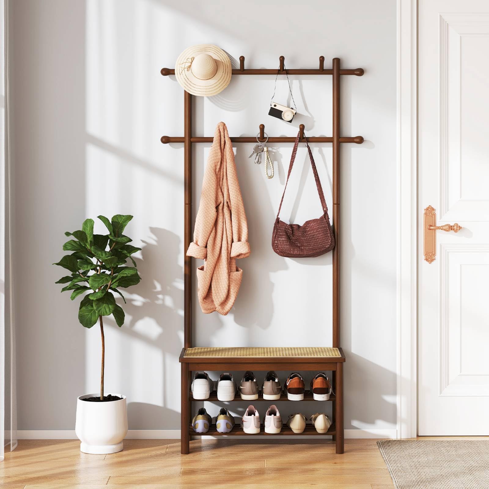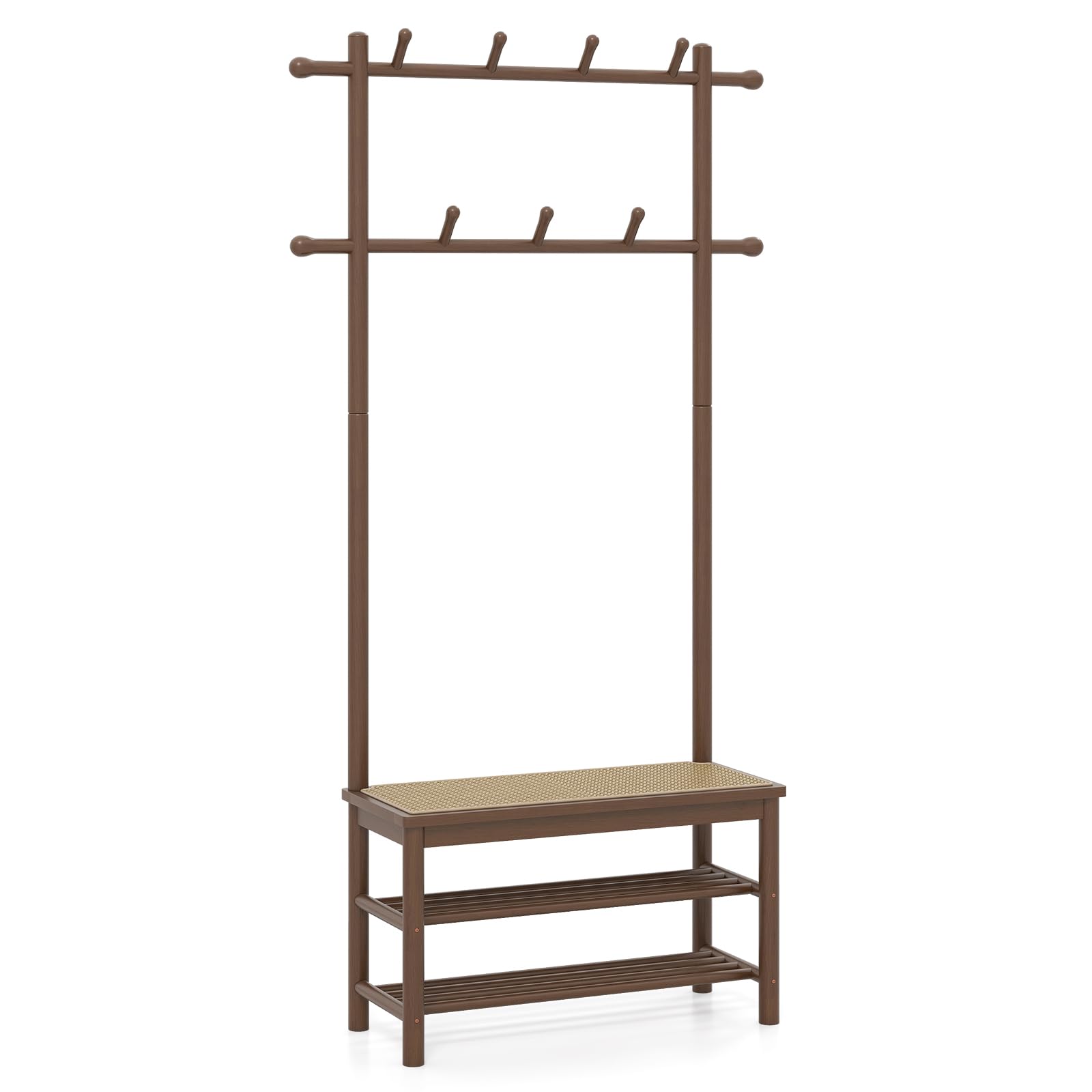 Maximize your entryway's functionality with this all-in-one hall tree, blending a coat organizer, shoe bench, and storage rack into a single stylish piece. Made from sturdy solid bamboo with a smooth, easy-to-clean finish, it boasts 2 hanging rods and 11 rounded hooks that gently hold your outerwear without leaving marks. Ample open shelving and a raised bottom clearance offer perfect spots for shoes and slippers. The seating area showcases hand-woven PE rattan, prized for its durability - resisting fading, tearing, and unpleasant smells - while adding rustic charm. Equipped with an anti-tipping safety kit and protective foot pads, this versatile storage bench fits seamlessly into mudrooms, foyers, bedrooms, or living rooms, helping you maintain a neat, inviting space with ease.