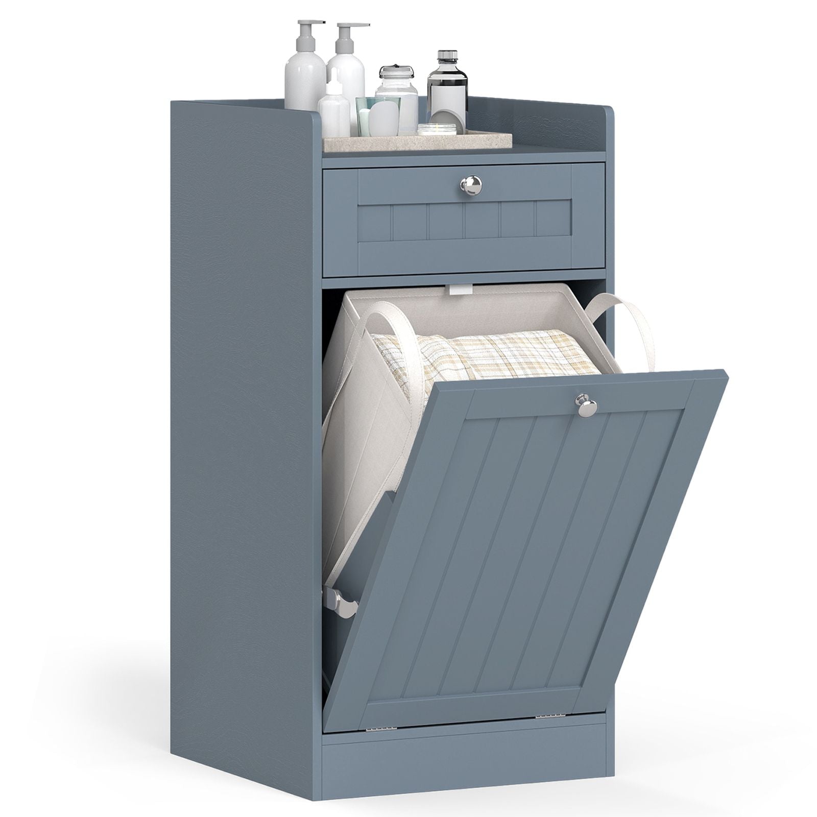 Featuring a tilt-out hamper to collect dirty clothes and towels, plus a roomy top and deep drawer for supplies, this laundry cabinet is the perfect storage solution for busy bathrooms or laundry spaces. The removable liner with handy carry handles means lifting and sorting laundry is always simple. Robust hinges, sturdy panels, and an anti-toppling kit help keep your essentials safe and your cabinet securely in place. With its clean farmhouse charm and compact size, this cabinet adds both function and flair. It is just right for bathrooms, laundry rooms, or any space that needs an organization upgrade!