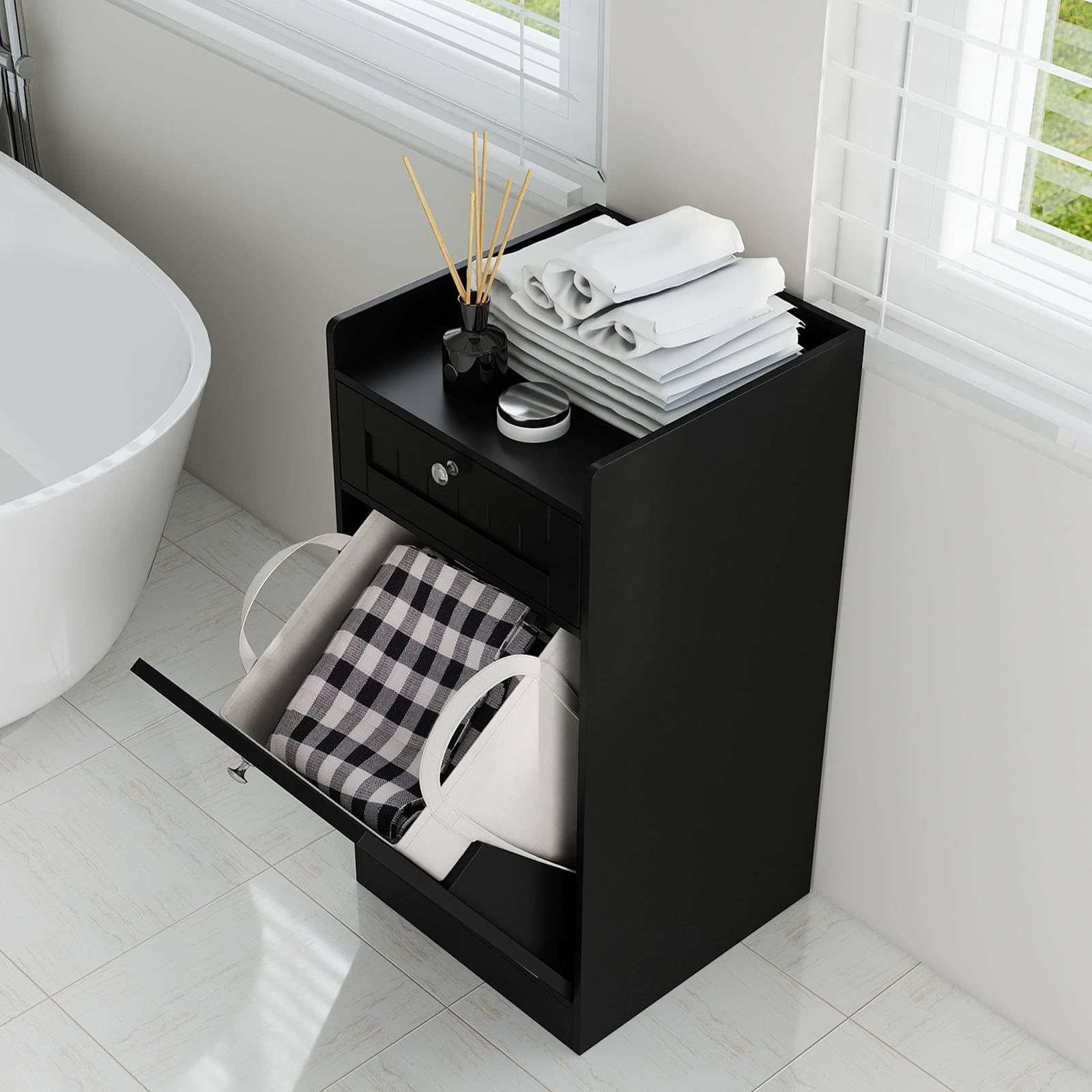 Multiple Storage Areas: This bathroom floor cabinet features a tilt-out laundry hamper that easily holds everything from T-shirts and pants to towels and socks. It also come with a spacious top and a deep drawer, providing plenty of space for your laundry essentials and supplies.