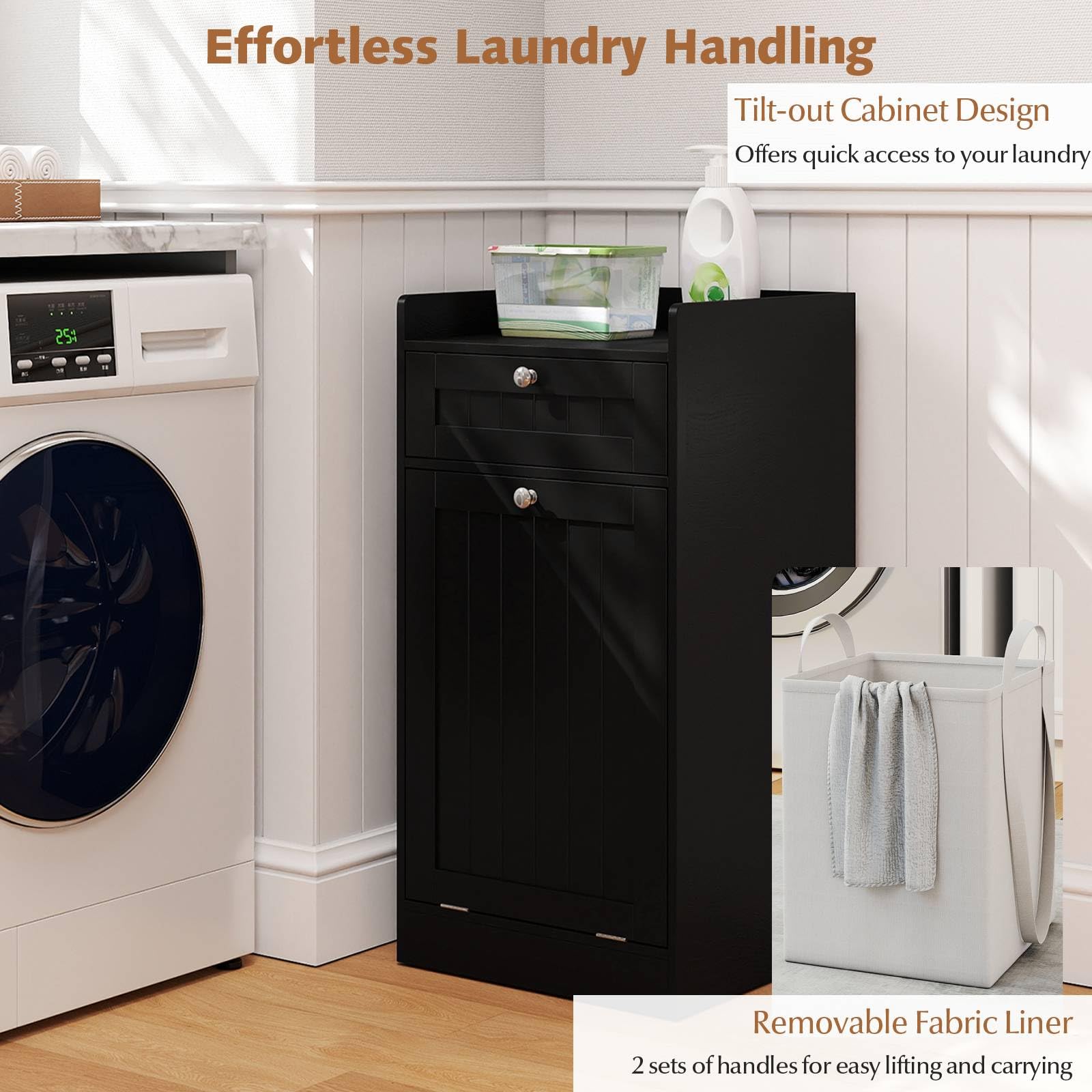 Effortless Laundry Handling: The tilt-out cabinet design offers quick, easy access to your laundry when it’s time to sort or wash. Its removable fabric liner features 2 sets of handles, so you can lift and carry loads to the washing machine without hassle.