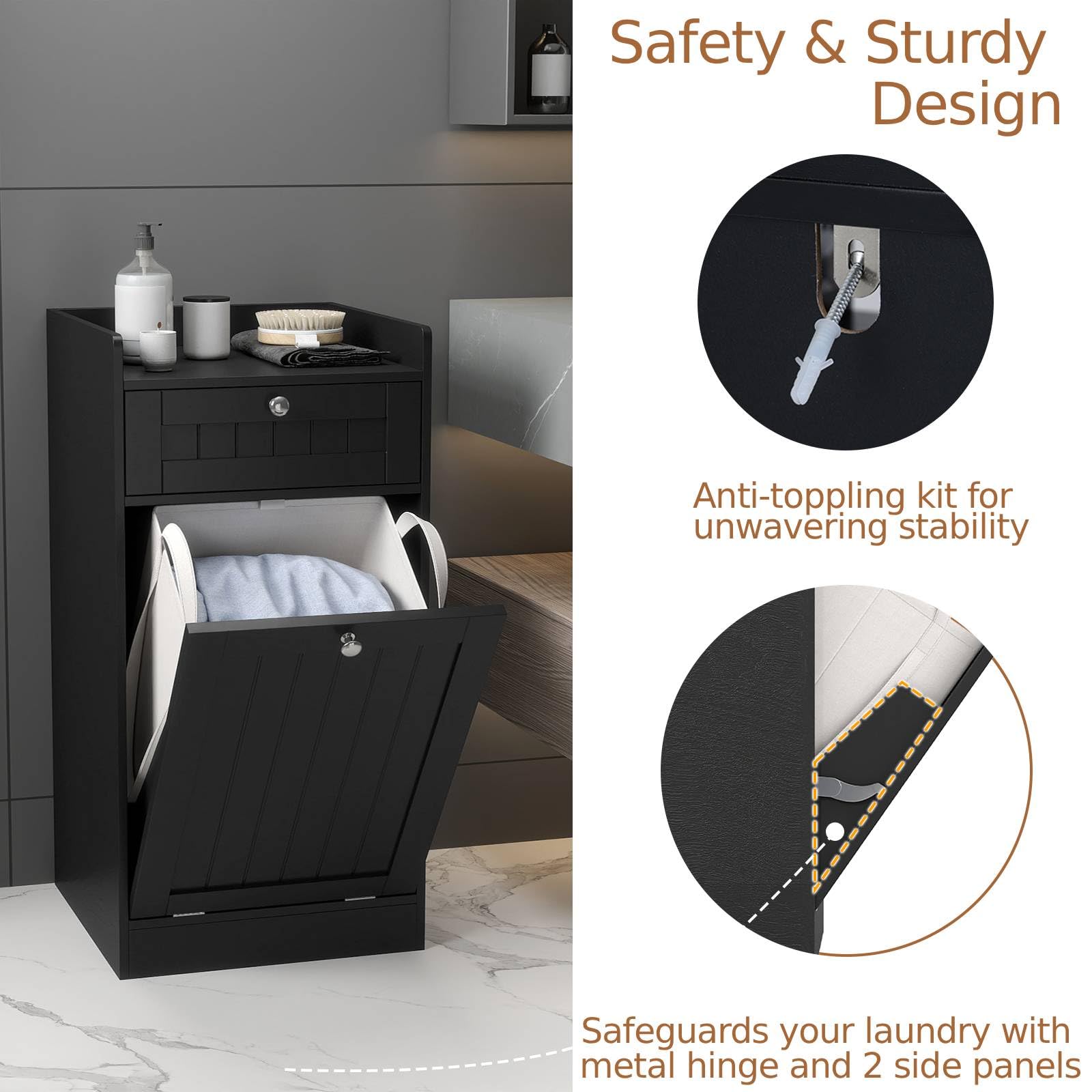 Safety & Sturdy Design: Sturdy metal hinges ensure the laundry compartment glides open with ease, while 2 side panels helps to secure your laundry. Plus, this laundry hamper cabinet comes also with an anti-toppling kit to keep it securely in place in any room.