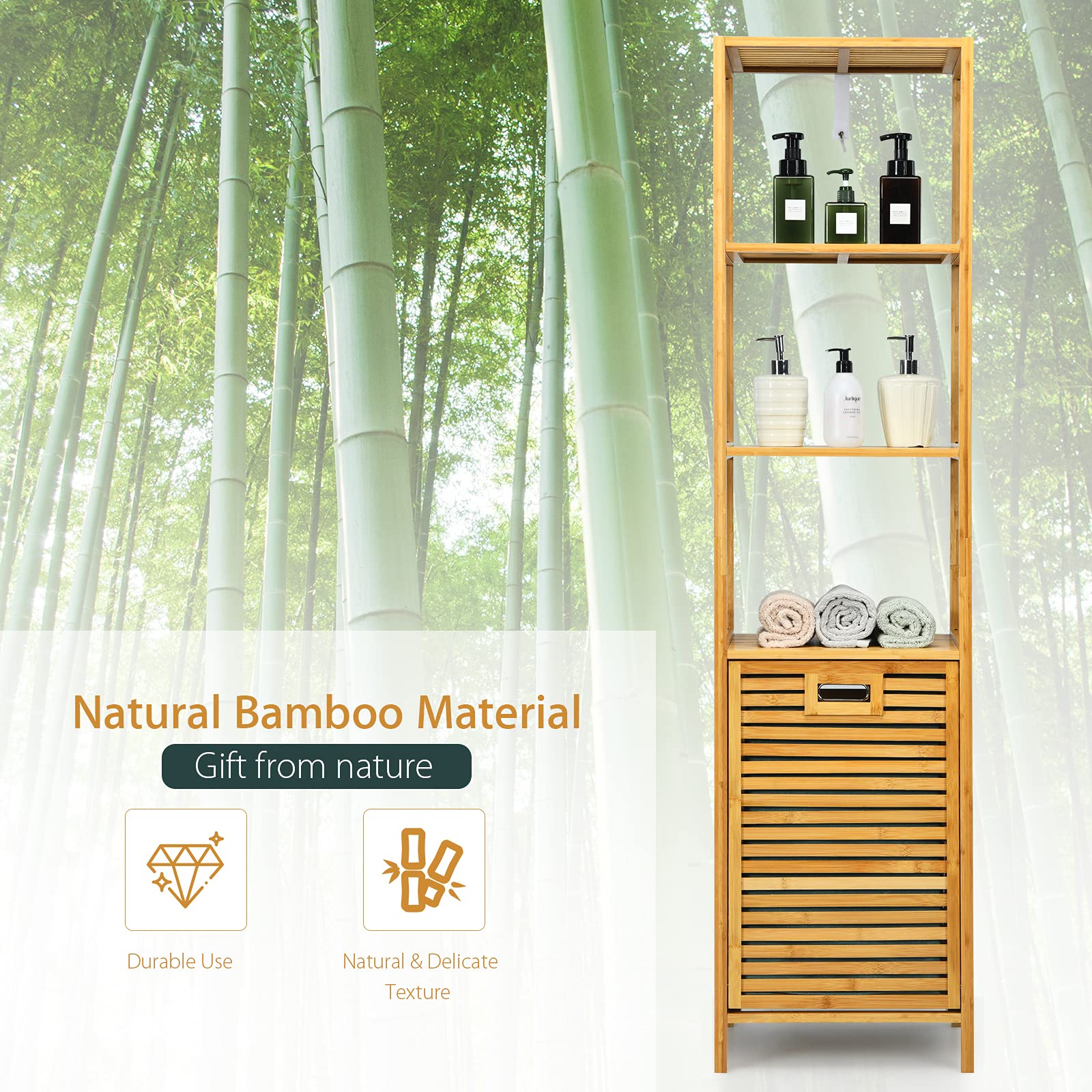 2-in-1 Bathroom Tower Shelf: Featuring the 2-in-1 design, the laundry hamper specially combines with storage shelf. The 3-tier storage shelves keep bathroom ware and sanitation supplies in great order and within arm’s reach. And the hamper provides ample space to keep clothes, towels, caps organized.
