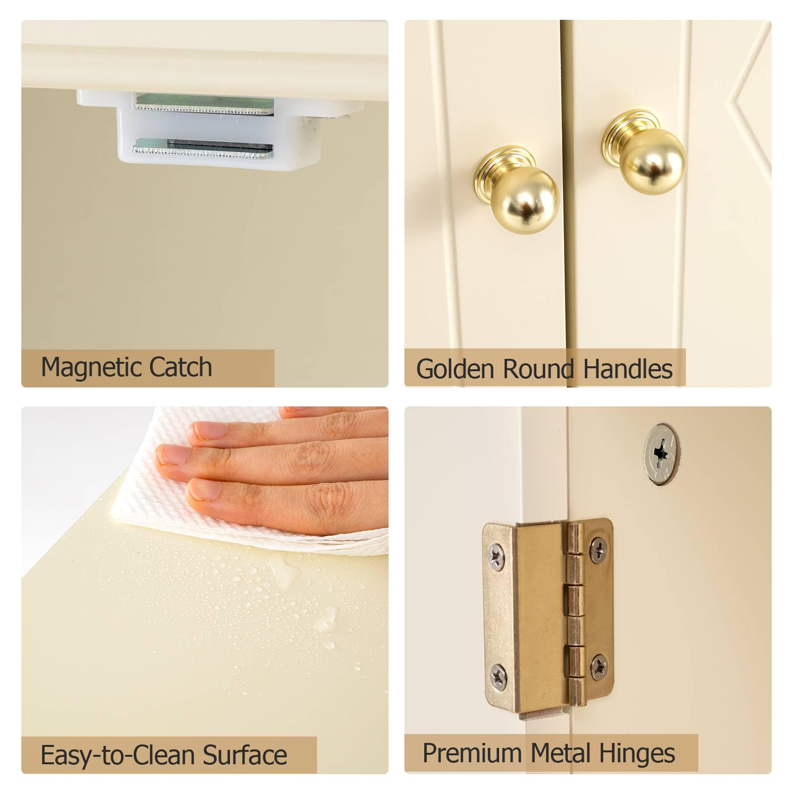 Exquisite Workmanship: This 2-door bathroom wall cabinet comes with a magnetic catch that ensures secure door closure every time. The premium metal hinges offer long-lasting use, while the easy-to-clean surface makes maintenance effortless.