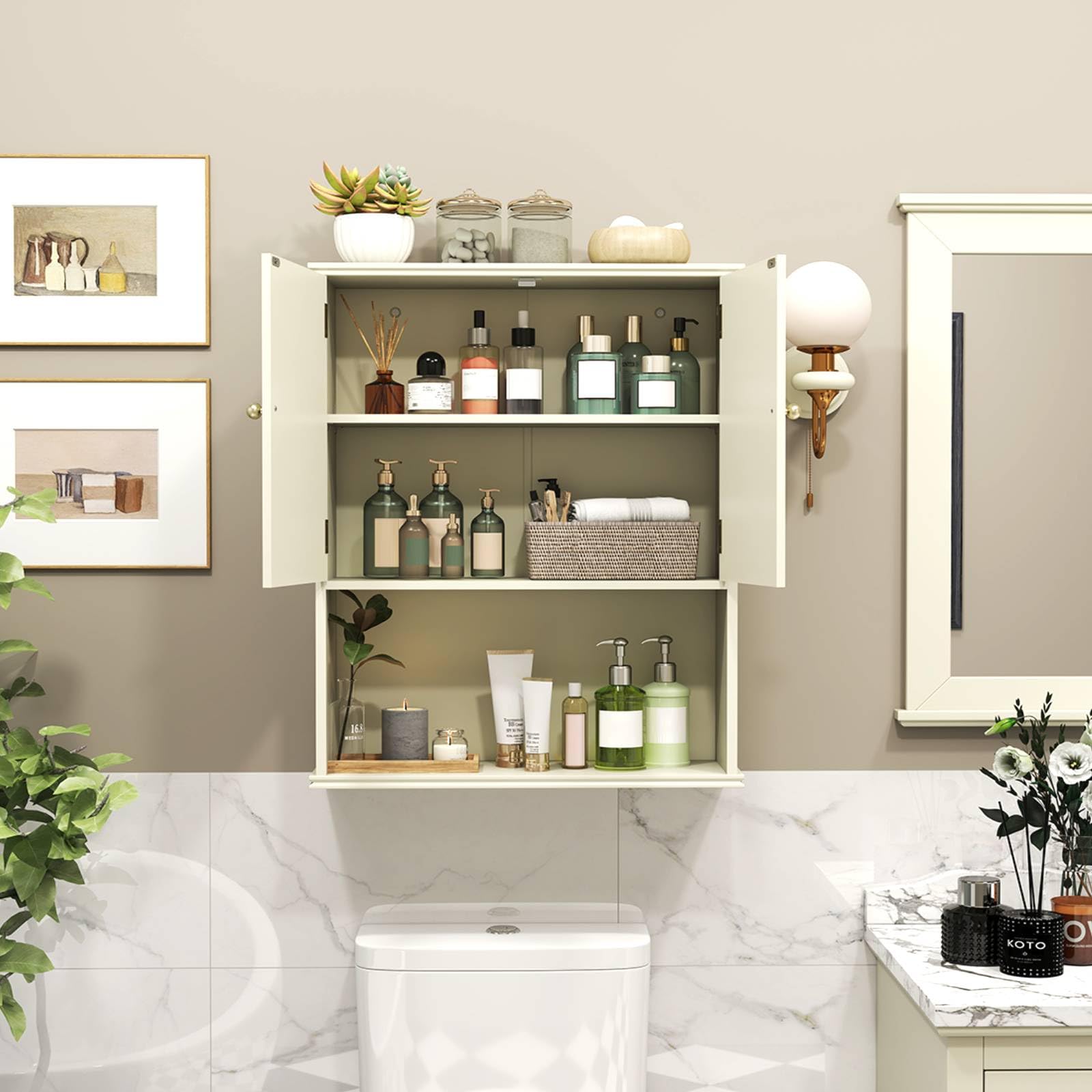Large Storage Space: This double door wall cabinet keeps your essentials organized and hidden for a clutter-free bathroom. The lower open shelf gives you quick access to your most-used items or offers additional display space for decorations.