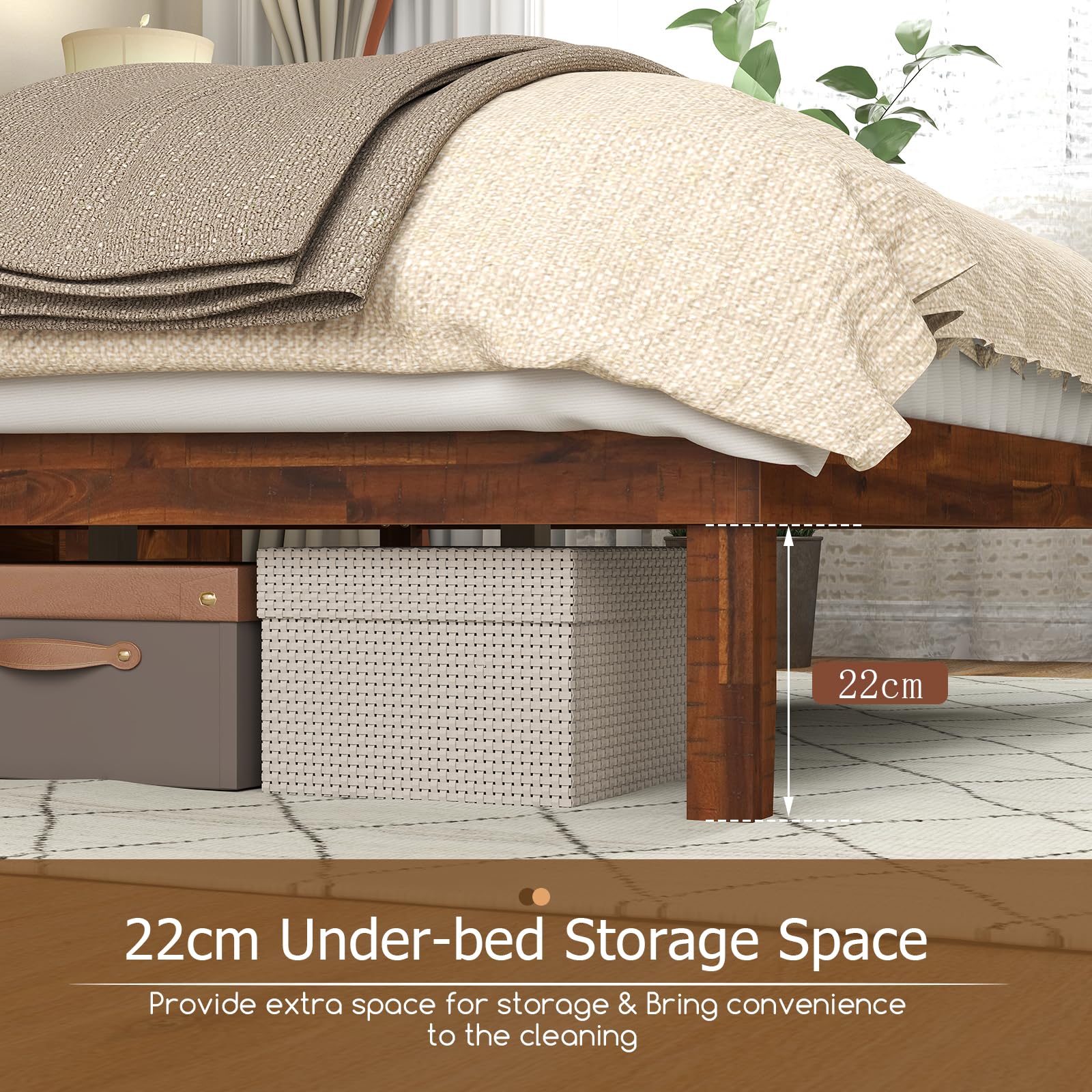 Featuring retro walnut headboard, this bed frame seamlessly blends with various bedroom interiors while ensuring cozy back support. Crafted from high-quality acacia wood, known for its durability and pleasing grain texture, the bed frame boasts sturdy support and long-lasting use. It incorporates strong plywood slat system and middle support legs which evenly distribute weight. Besides, the ample under-bed storage space makes it easy to store items and clean the room. All in all, the platform bed exudes charm and character, adding a touch of nostalgia to any room.