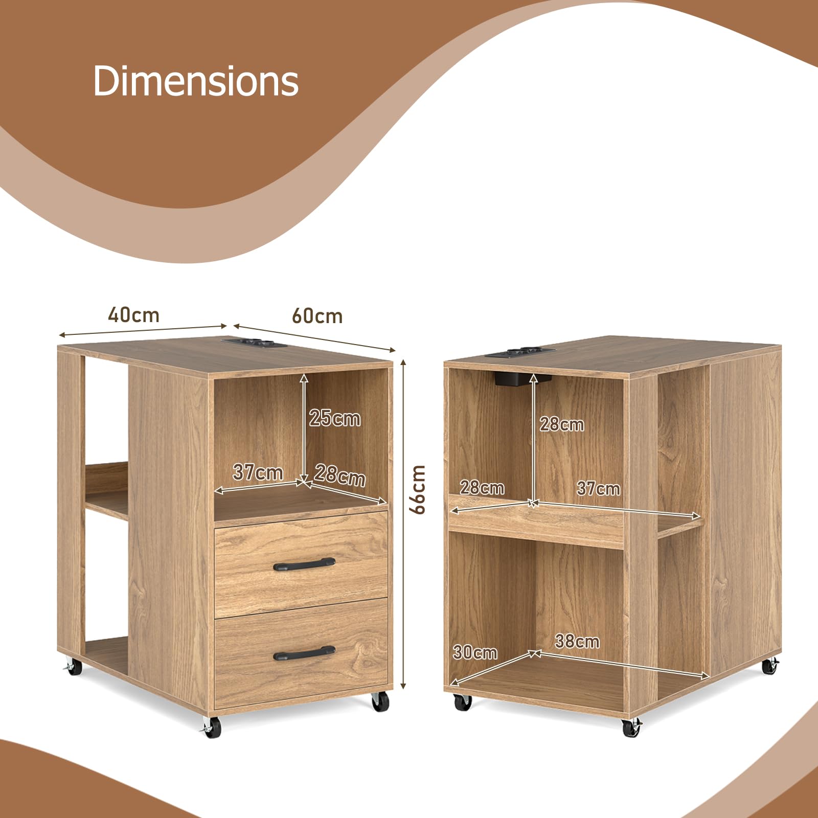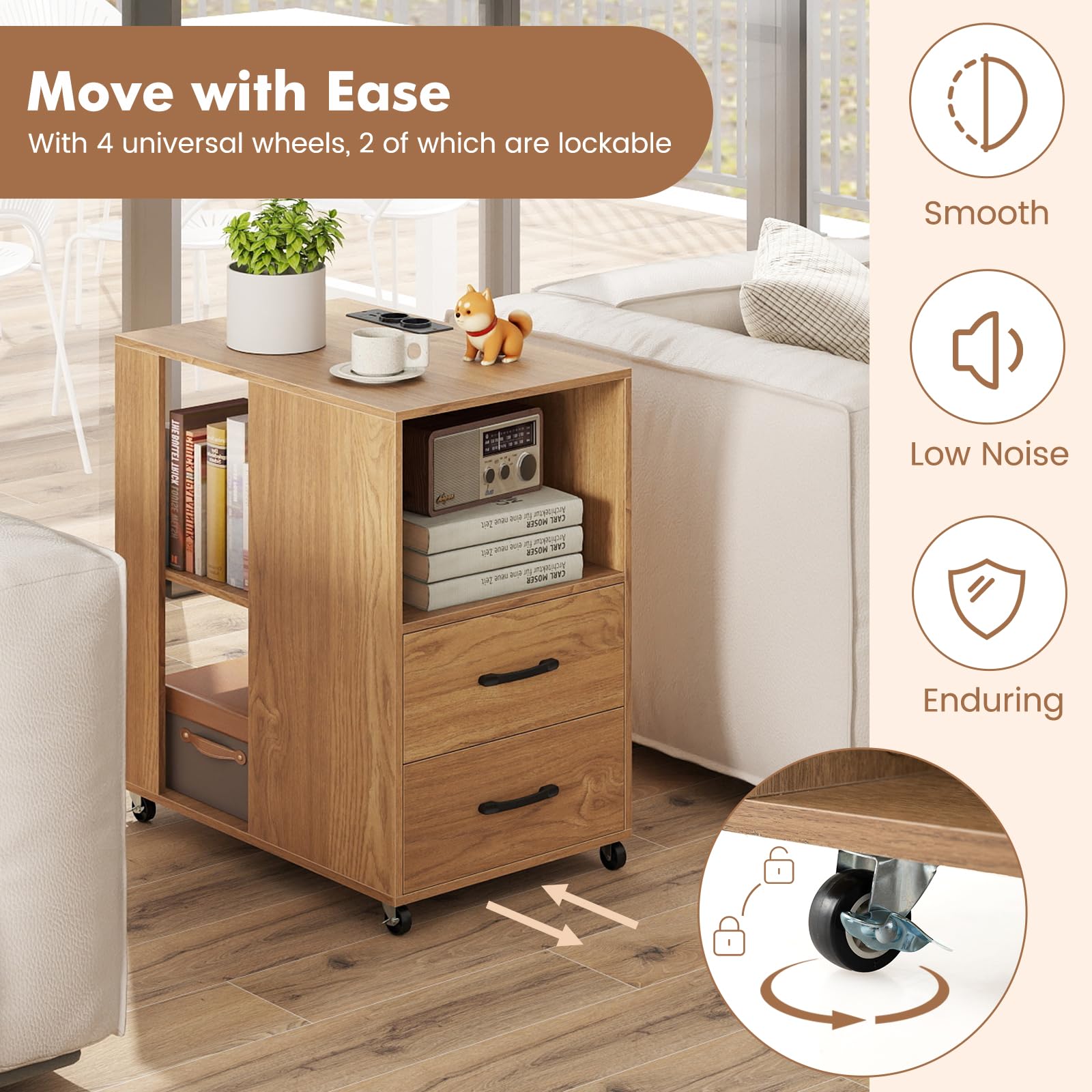 Upgrade your furniture with a versatile mobile side table featuring a convenient built-in charging station and ample storage options. The bedside table includes 2 AC outlets, a USB port, and a Type-C port, keeping your devices powered and accessible. More, it offers multiple front-side storage areas, including a tabletop, open compartment, and 2 drawers. The back shelves also provide large storage space to store a variety of items in an organized manner. Effortlessly move the bedside cabinet with 4 universal wheels that produce low noise, 2 of which are lockable for stability. The rolling nightstand is perfect for use as a bedside chest, end table, or study mobile filing cabinet.