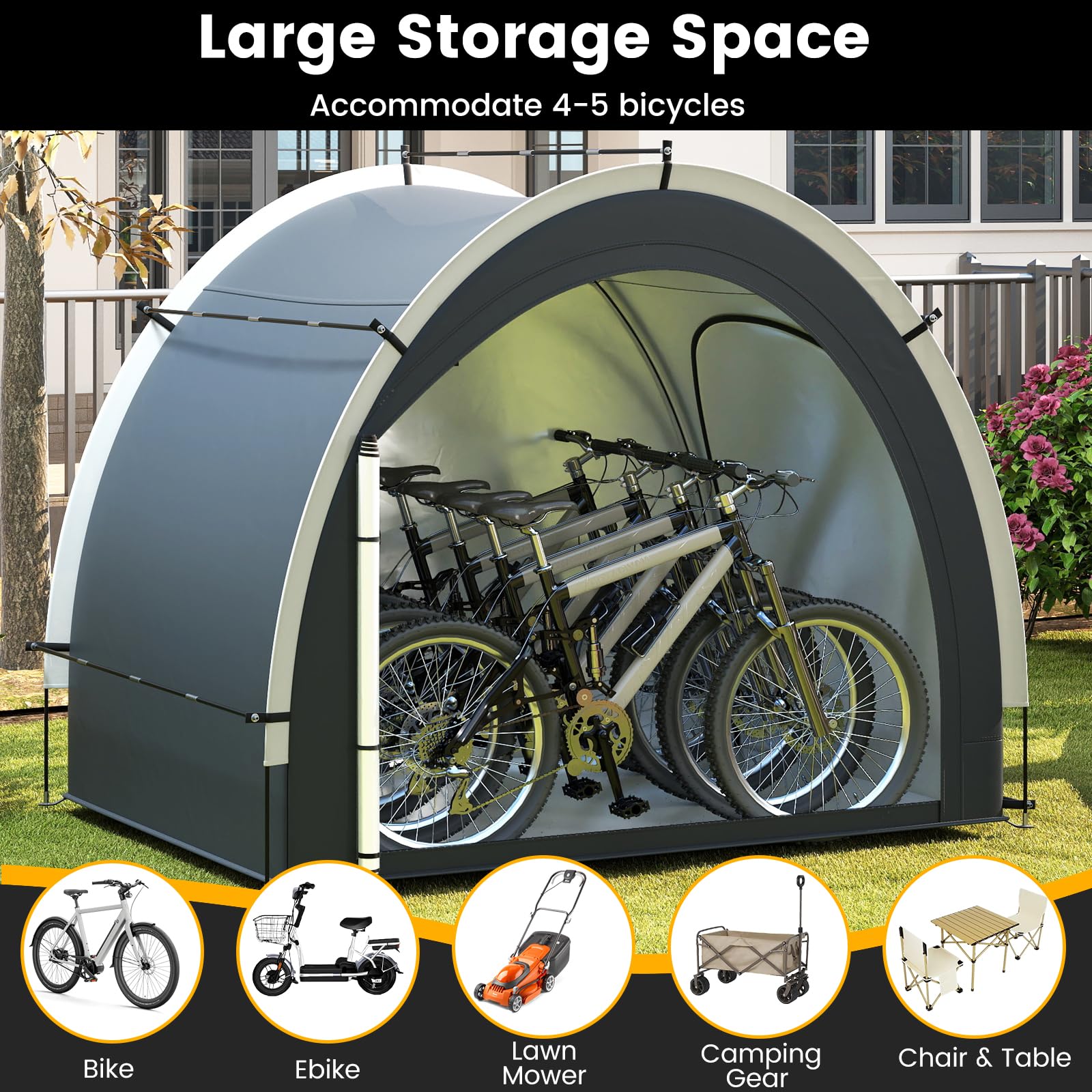 Suitable for storing bikes, tools, toys, lawn mowers, and pool items
