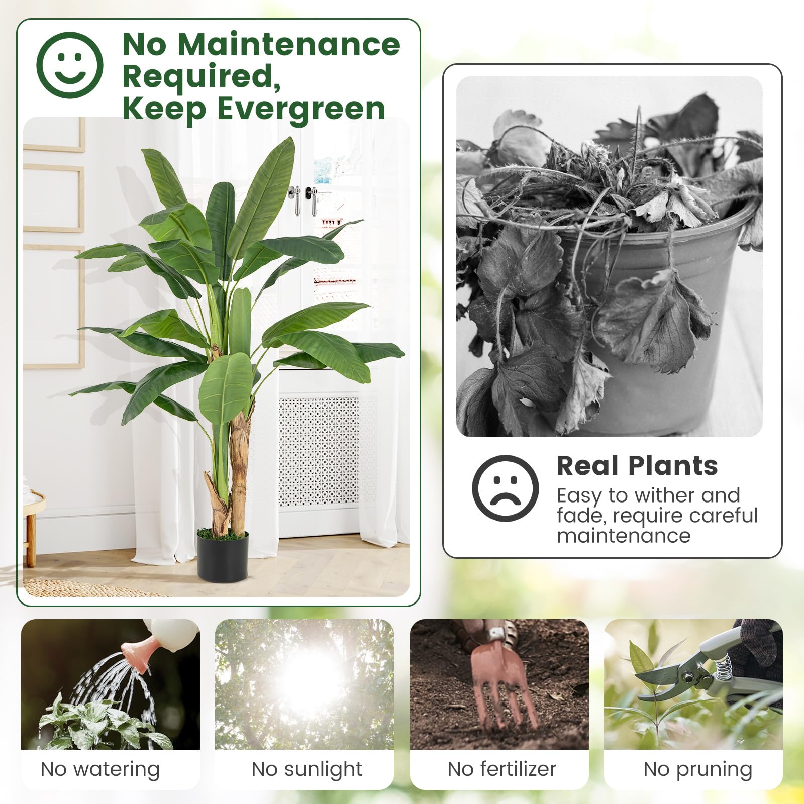 High-Quality & Maintenance-Free Material: The faux leaves are crafted of premium polyester fabric, which is not only non-odor and non-allergic for safety but also crack-resistant and built to last. Moreover, it requires no watering, sunlight, fertilizer, or pruning, keeping evergreen.