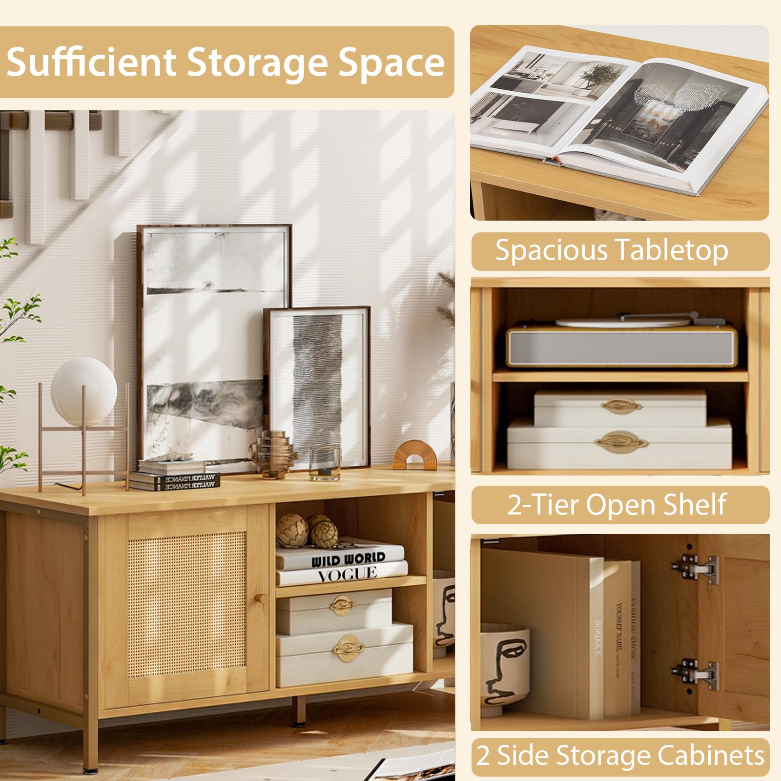 Boho Inspiration: This exquisite piece combines the warmth of oak wood grain, the beauty of natural PE rattan weaving, enhancing the aesthetic appeal of your space. Thus, this PE rattan TV stand is quite an eye-catching addition to your bedroom, living room or entryway.