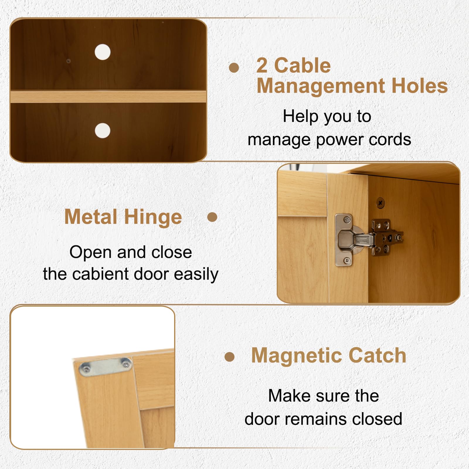 Use with Convenience: The back of the entertainment center is equipped with 2 cable management holes to help you better manage power cords. Besides, the metal hinge is easy to open and close the cabinet door.