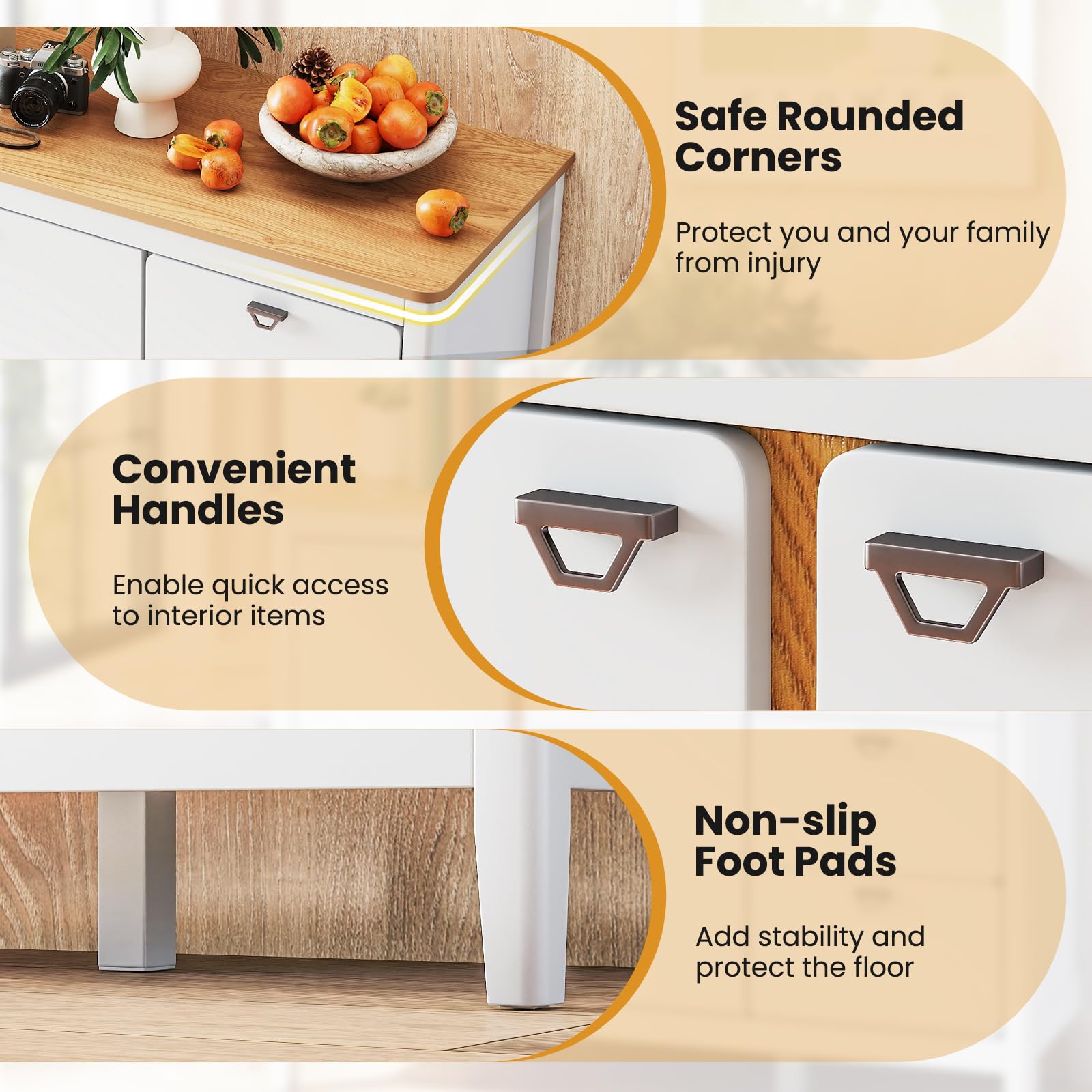 Boasting 3 spacious drawers and 2 doors, this cabinet provides ample space to neatly organize your tableware, snacks, and kitchen supplies. The wide table top offers a perfect extension for your kitchen counter where you can conveniently place small appliances or decorations. Moreover, the shelf in the side cabinet has 3 adjustable heights (height of each layer: 6cm ), and the board can also be taken away to hold larger items. Crafted from durable materials with five solid legs, this freestanding cabinet ensures long-lasting use. What's more, this buffet sideboard is designed with handles on doors and drawers for easy access. The anti-toppling devices can help to fix the cabinet for safety, and anti-slip foot pads will protect your floor. Moreover, its multifunctional design allows you to use it not only as a kitchen storage cabinet but also as a dining room cupboard or a coffee bar table in the living room. Add this multifunctional cabinet to your space and experience the perfect blend of functionality and elegance.