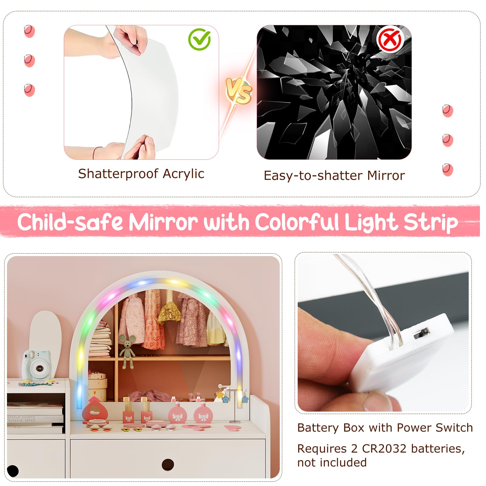 Clear Mirror with Light Strip: The vanity desk is designed with a 39 x 31cm (L x W) large mirror for clear reflection for makeup, hair styling, or dress-up play. Plus, the mirror is surrounded by colorful LED light strip to add a magical feeling.