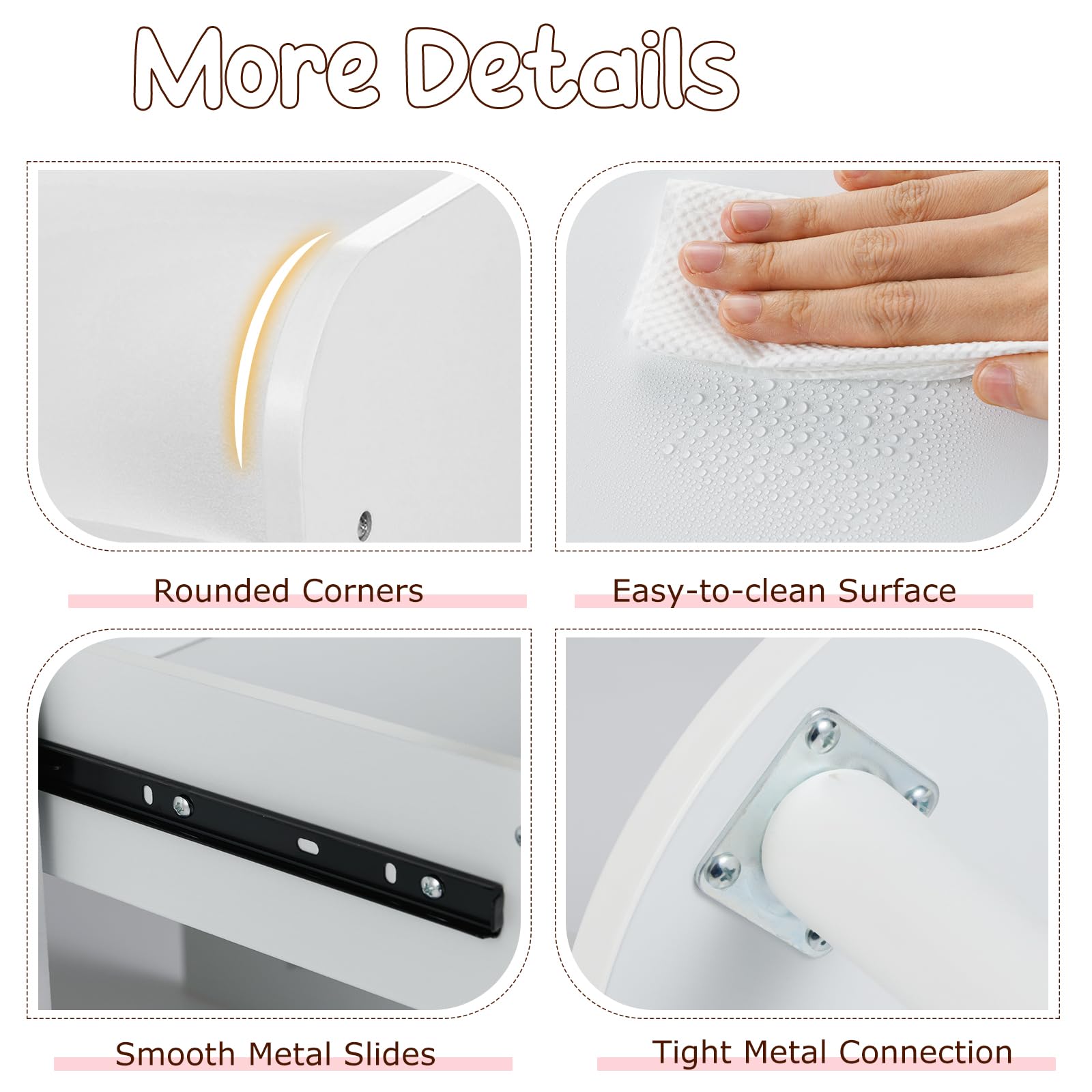 Multiple Storage Options: 2 drawers with 2 sizes and 2 compartments with 2 sizes offer ample space for kid’s hair accessories, books, toys, or other essentials. Moreover, kids can also place their items on the spacious tabletop for easy reach.
