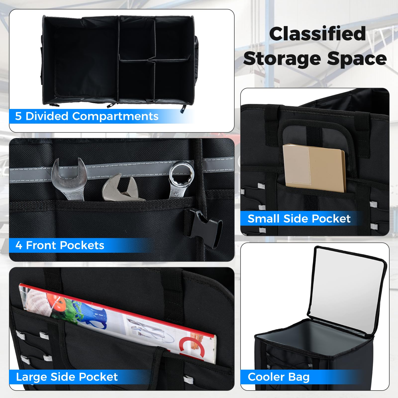Classified Storage Space: 5 divided compartments, 4 front pockets, 1 large side pocket, 1 small side pocket and bonus bungee ropes enable this car storage box to accommodate groceries, sports gear and emergency kits in order. And the removable dividers allow you to use it in fully expanded mode or half-folded mode.