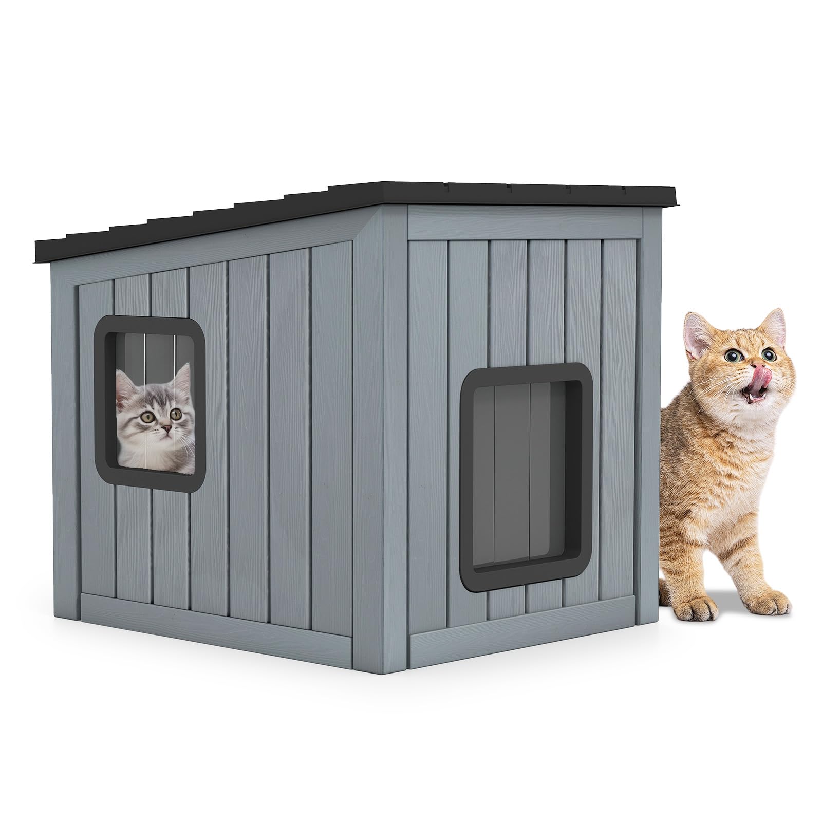 The waterproof cat house is crafted from PP that resists sun damage and fading for prolonged outdoor exposure. The sloped roof allows rainwater to flow off effortlessly, while drainage holes prevent water accumulation inside, making maintenance straightforward. Featuring 2 PVC doors, it promotes airflow and gives pets easy entry and exit. Its tile-inspired exterior lends a subtle rustic feel, blending seamlessly with both indoor and outdoor environments. Beyond cats, this versatile shelter is suitable for small animals like rabbits and puppies. Moreover, assembly is quick and tool-free, allowing you to set it up with minimal effort.