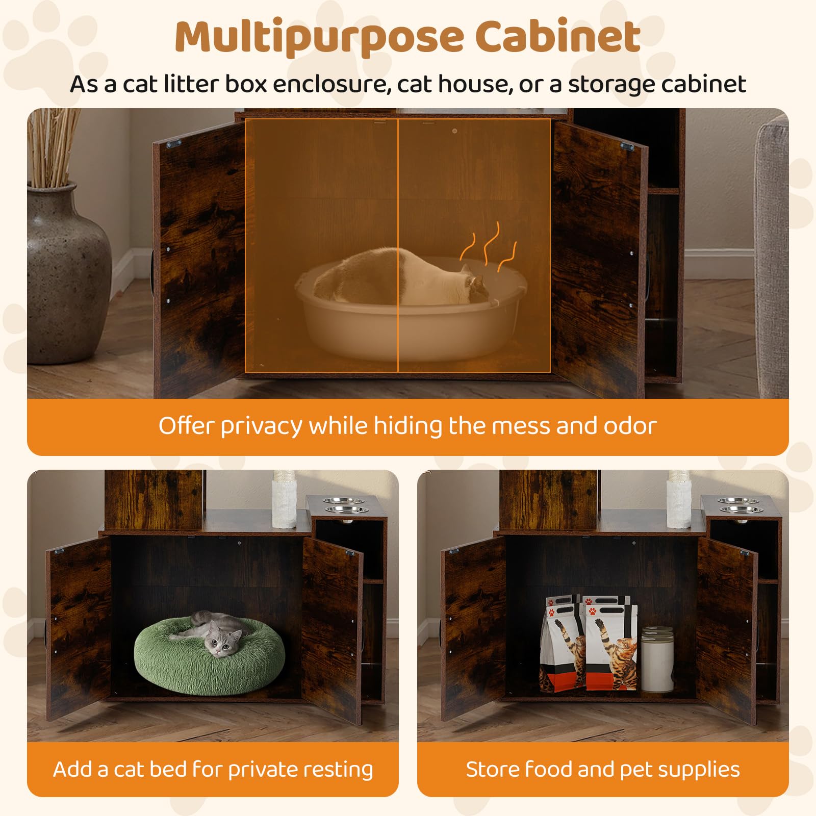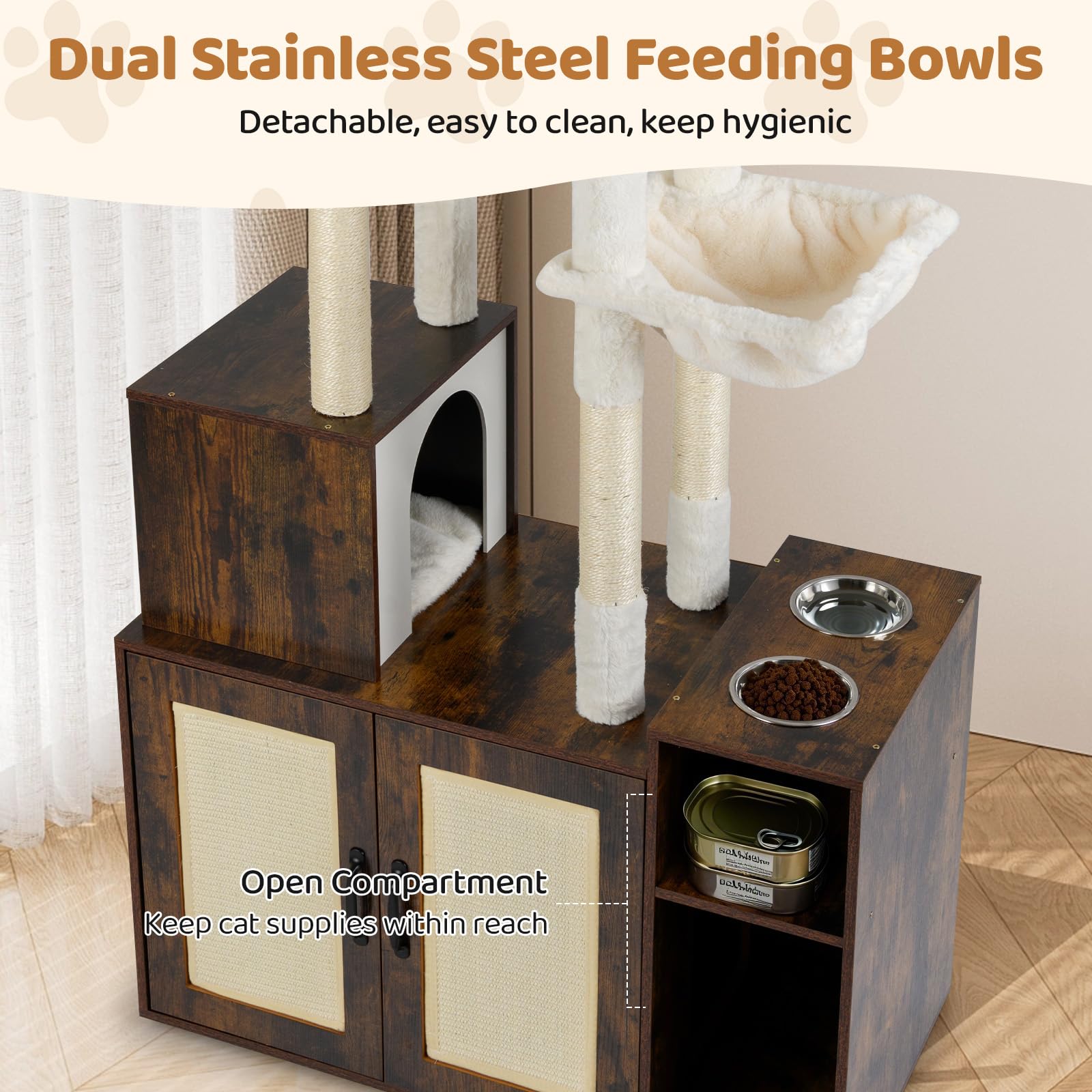| Package Includes | 1 x Cat Tree with Litter Box Enclosure, 2 x Stainless Steel Bowls, 1 x User’s Manual |