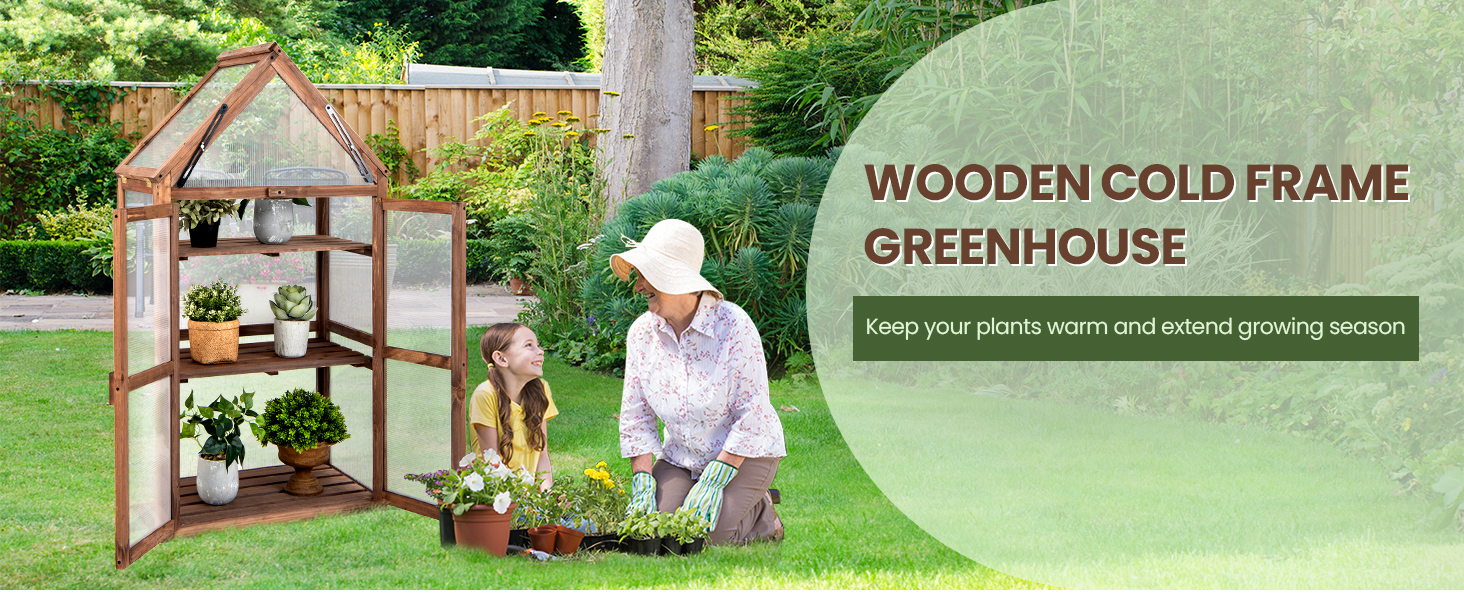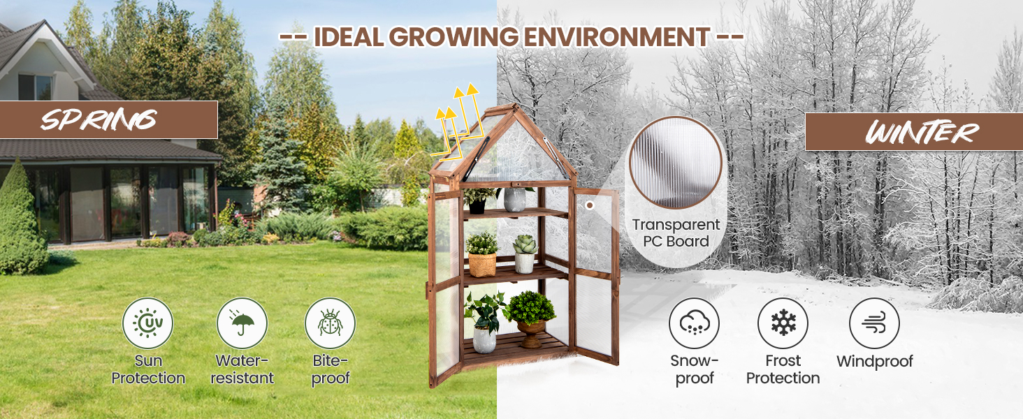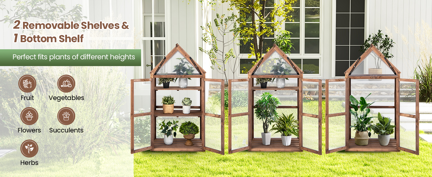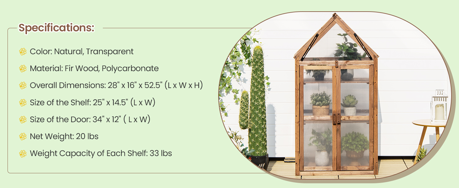 The cold frame greenhouse will bring excellent care for your plants with excellent craftsmanship. It has a sloping roof that is resistant of rain. Besides, on sunny days, the roof can be opened for good ventilation by controlling side support bars. The mini greenhouse is made of transparent polycarbonate panels, which allows plants to fully absorb sunlight while also keeping the heat inside, providing an ideal growing environment for plants and extending their growing season. There are 3 shelves inside the flower planter to provide enough space for your growing tools and plants. In addition, these three shelves are removable so you can adjust the shelves according to the height of your plants. The greenhouse is made of natural fir wood not only ensures good durability and sturdiness, but also allows you to freely paint other colors according to your preference, making it a bright decoration to put in your garden, porch, and balcony.