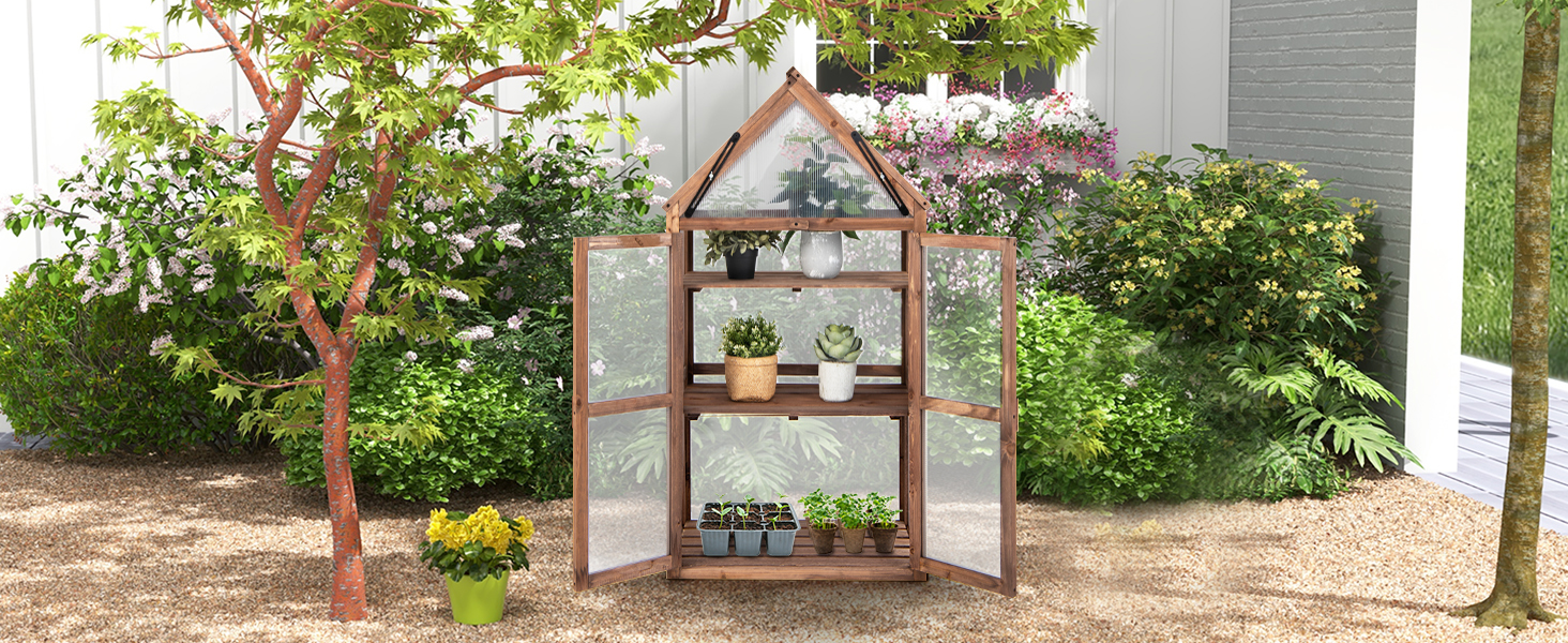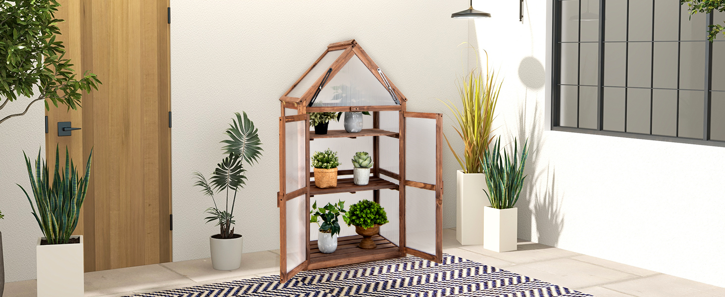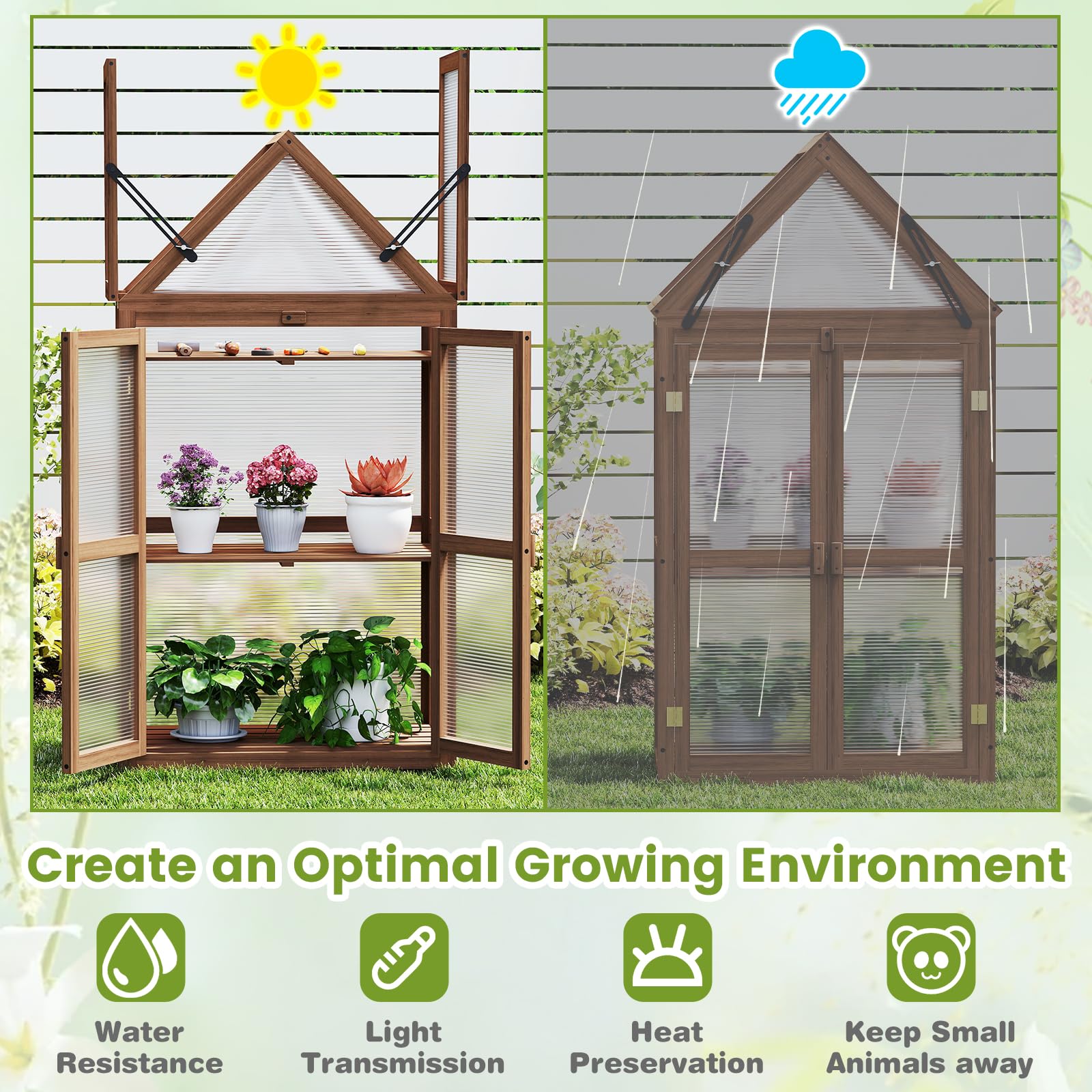 The cold frame greenhouse will bring excellent care for your plants with excellent craftsmanship. It has a sloping roof that is resistant of rain. Besides, on sunny days, the roof can be opened for good ventilation by controlling side support bars. The mini greenhouse is made of transparent polycarbonate panels, which allows plants to fully absorb sunlight while also keeping the heat inside, providing an ideal growing environment for plants and extending their growing season. There are 3 shelves inside the flower planter to provide enough space for your growing tools and plants. In addition, these three shelves are removable so you can adjust the shelves according to the height of your plants. The greenhouse is made of natural fir wood not only ensures good durability and sturdiness, but also allows you to freely paint other colors according to your preference, making it a bright decoration to put in your garden, porch, and balcony.