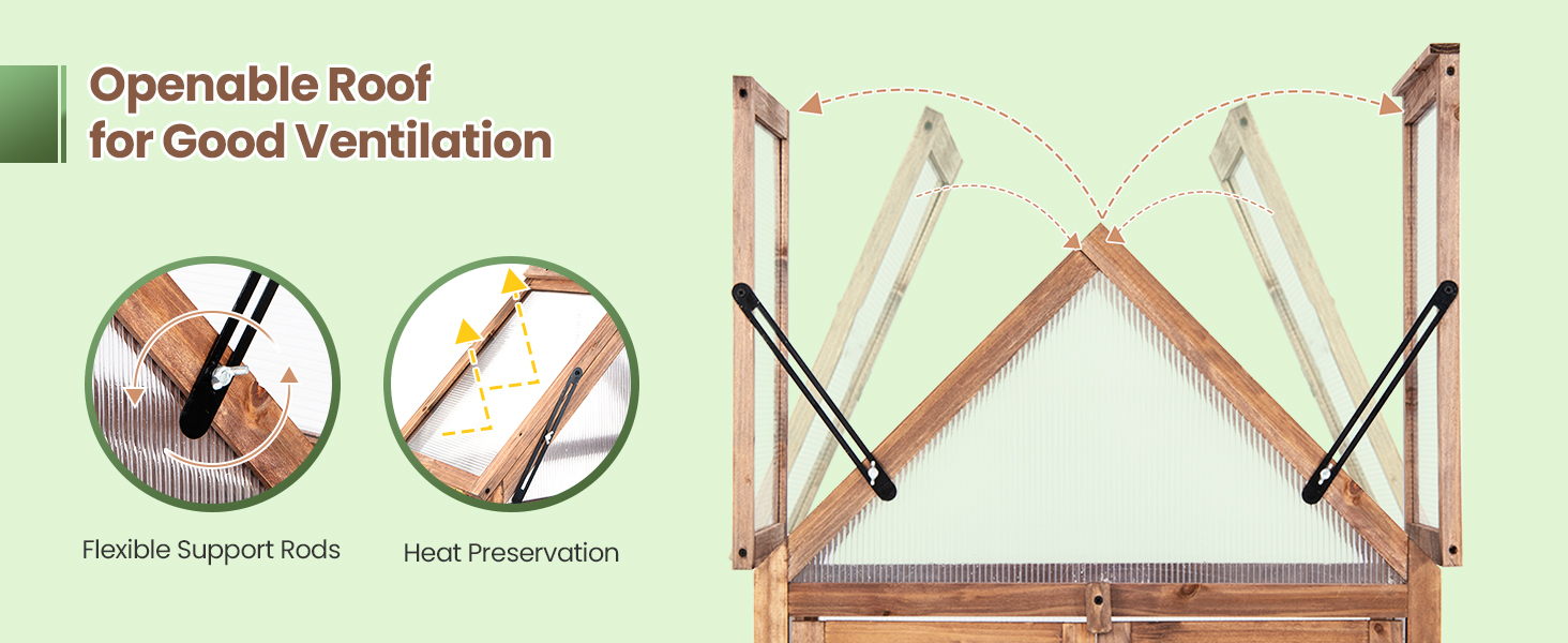 Openable Doors and Tilted Roof: Our wooden greenhouse comes with double doors that are equipped with easy-grip handles for adding convenience in placing plants. And it features a tilted roof for quick drainage in rainy days to avoid water accumulation. In addition, the support bars on the side can control the opening and closing of the top to provide you with good ventilation.
